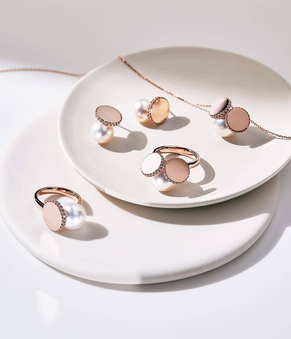 タサキ独自のサクラゴールドを使ったディスクと、艶やかなパールを遊び心あるバランスでセット。ダイヤモンドで縁取られたディスクが光を受けて輝き、パールの柔らかな照りを一層引き立てます。角度によって表情を変える多彩なきらめきが、モダンでドラマティックな存在感を放つジュエリーです。