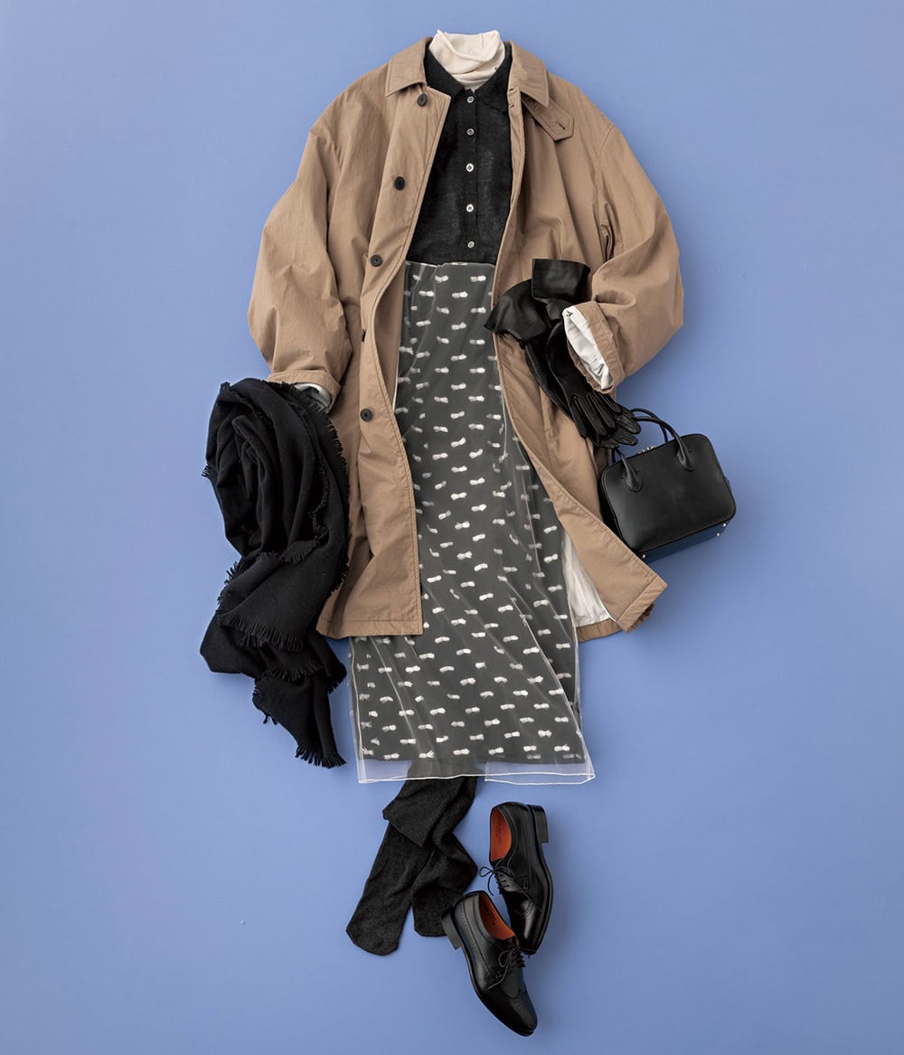 スカート¥30,000(シーニュ)トレンチコート¥143,000(エイトン青山)衿付きニット¥42,900(サクラ/インターリブ)ハイネックニット¥20,000(トゥ)バッグ¥68,200(メゾン カナウ/ヤマニ)シューズ¥39,600(ジャランスリウァヤ 日本橋)ストール¥41,800(アソース メレ/アイネックス)グローブ¥26,400(イタルグアント/アルアバイル)タイツ私物