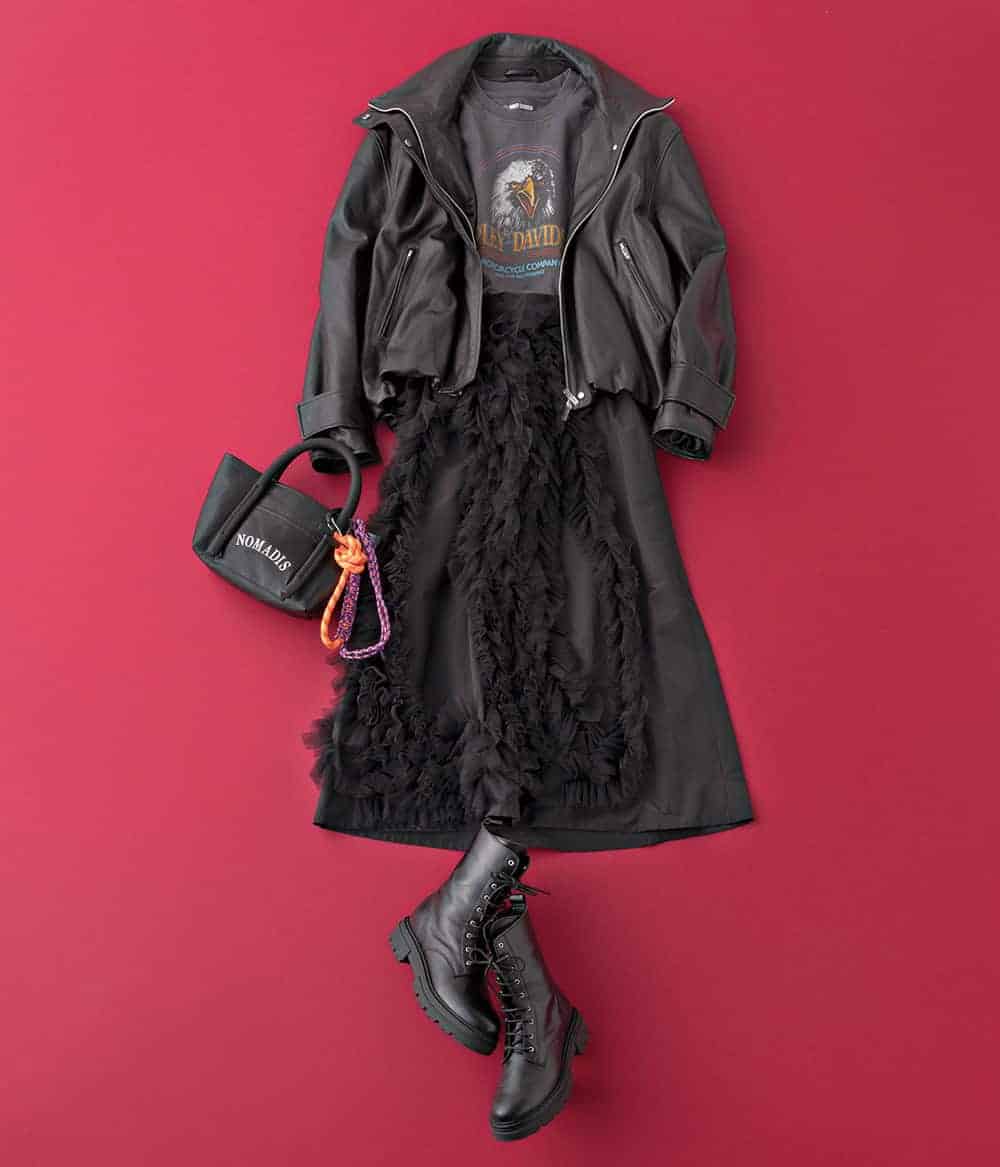 スカート¥36,000(シーニュ)ジャケット¥52,800(プランクプロジェクト/プランクプロジェクト 青山店)カットソー¥6,487(ハーレーダビッドソン/ハーレーダビッドソン ジャパン カスタマーサービス)バッグ¥22,000バッグチャーム¥11,000(ともにノマディス/ノーベルバ)ブーツ¥28,600(アルアバイル)