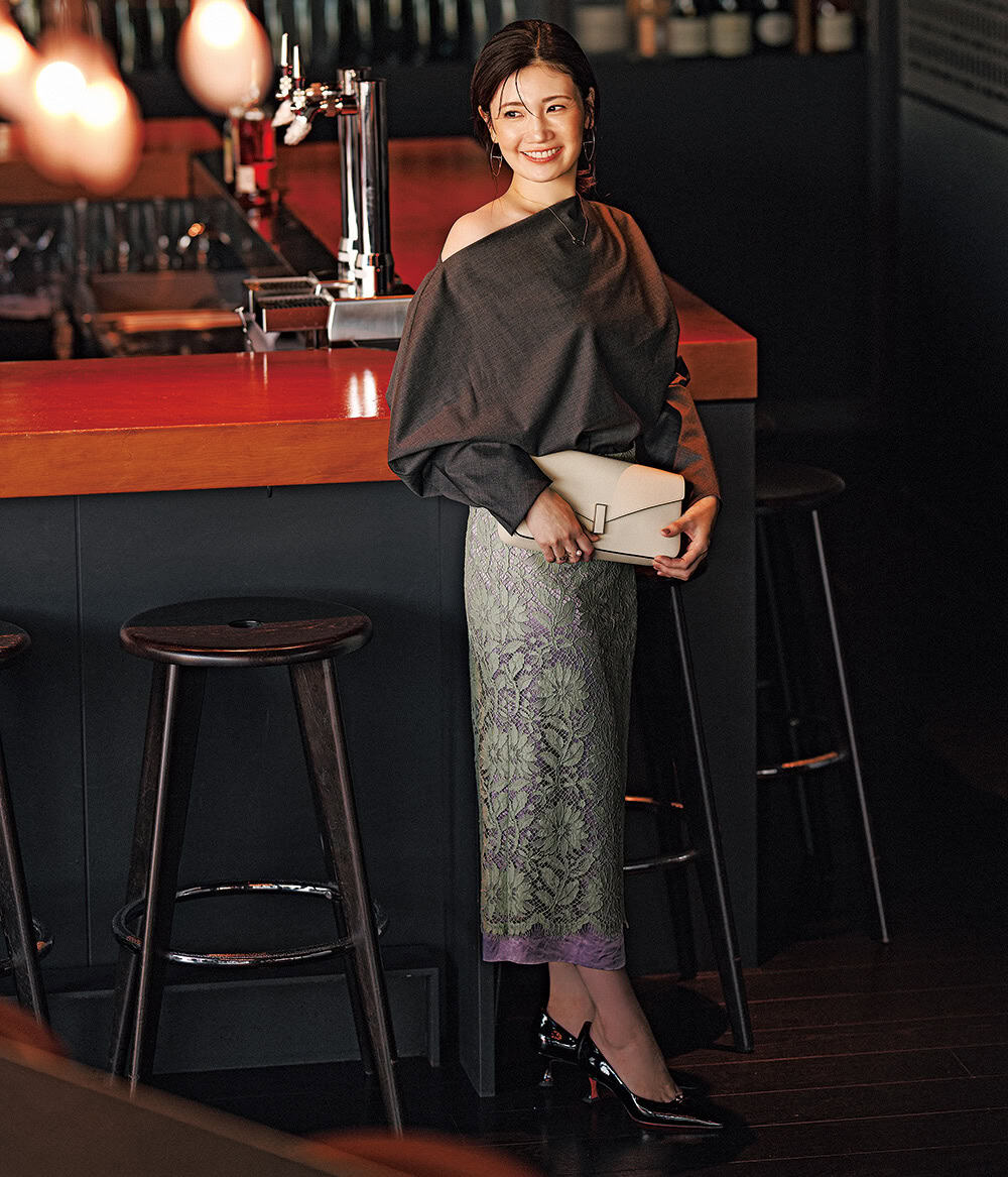 子どもを母に預けて、夫とちょっといいレストランで家族の年間計画を相談。パンツスタイルだと言葉にトゲが出てしまうこともあるので(笑)、やさしげのあるスカートを選びます。ミントグリーンのレースの下にラベンダーのサテン素材をレイヤードしたスカートは唯一無二の一枚。同窓会や会食など、さまざまな大人のオケージョンにも活躍の予感。