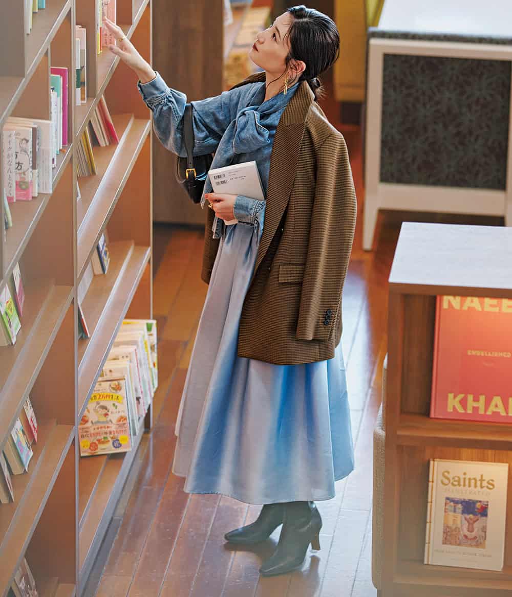 スカート¥44,000(ダブルスタンダードクロージング/フィルム)ジャケット¥36,300(ザ ポーズ/ウィムガゼット ルミネ新宿店)ブラウス¥44,000(ウィム ガゼット/ウィム ガゼット 玉川高島屋S・C店)バッグ¥103,400(J&M デヴィッドソン/J&M デヴィッドソン カスタマーセンター)ブーツ¥49,500(ダイアナ/ダイアナ 銀座本店)ピアス¥52,800(ブランイリス/ブランイリス トーキョー)リング[左手]¥2,530(シースキー/ロードス)リング[右手]¥13,200(ココシュニック オンキッチュ/ココシュニック)