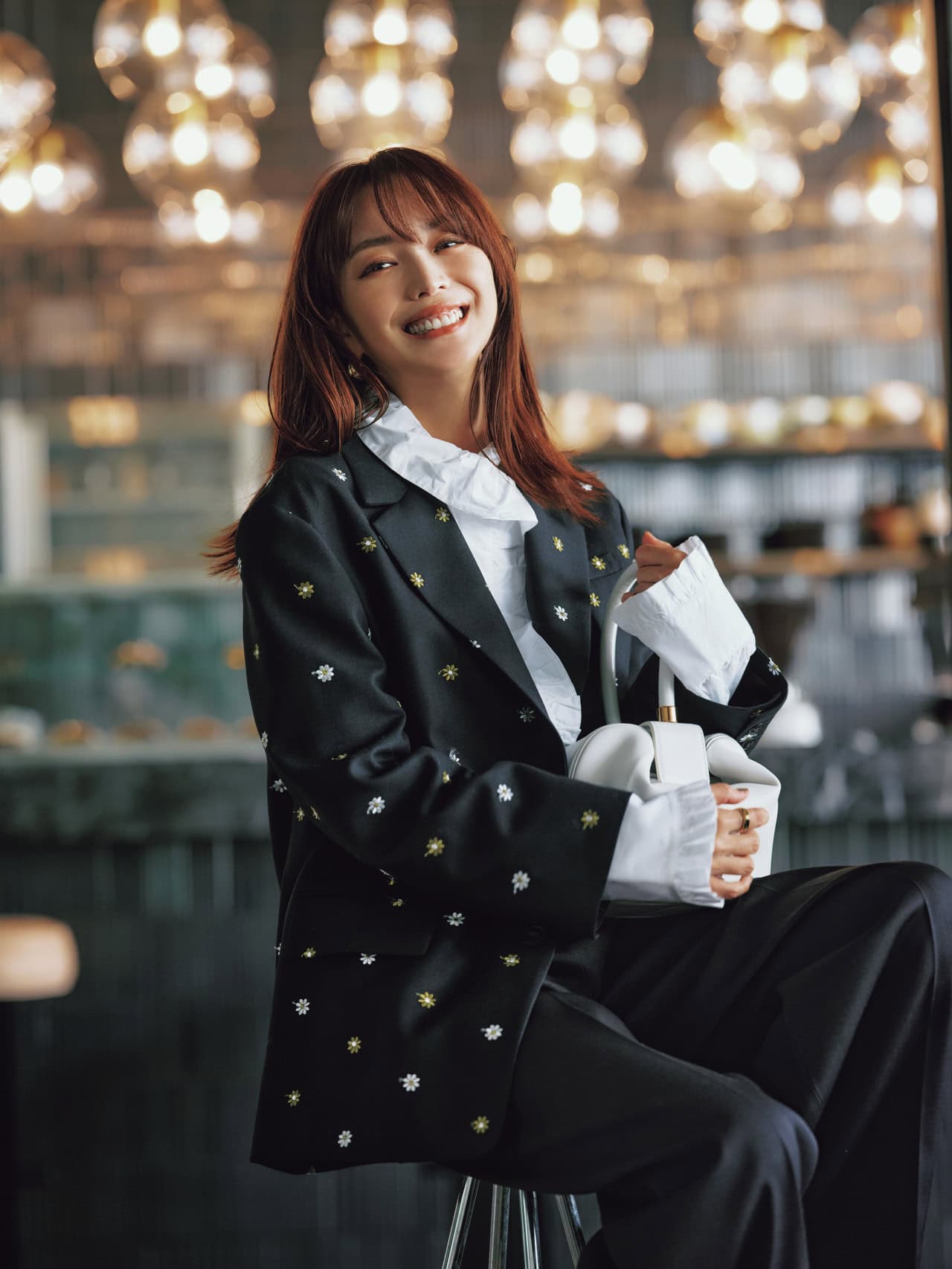 黒刺繡ジャケット¥67,100(イエナ ラ ブークル/イエナ ラ ブークル ニュウマン新宿店)フリルシャツ¥8,999(H&M Studio Holiday コレクション/H&M カスタマーサービス)パンツ¥28,930(エイチ ビューティー&ユース)バッグ¥462,000(ガブリエラ ハースト/ガブリエラ ハースト ジャパン)ピアス¥64,900リング¥276,600(ともにトムウッド/トムウッド 青山店)