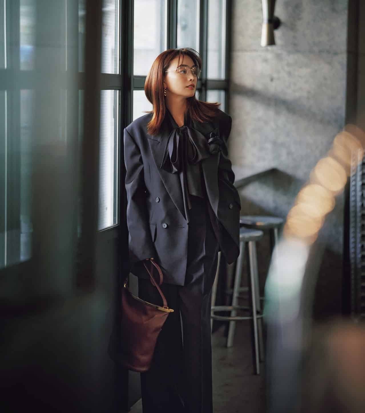 Uネックデザインのジャケットなら、きちんと感をキープしながらも、柔らかい女性らしい印象に。黒に寄せすぎないグレーズボンを合わせることで、式典スタイルに奥行きと高級感が生まれます。さらにアイテムでブラウンを効かせれば、さりげなくトレンド感もプラス。ほぼ黒に終わらせない配色バランスが今っぽい、高感度コーデです。