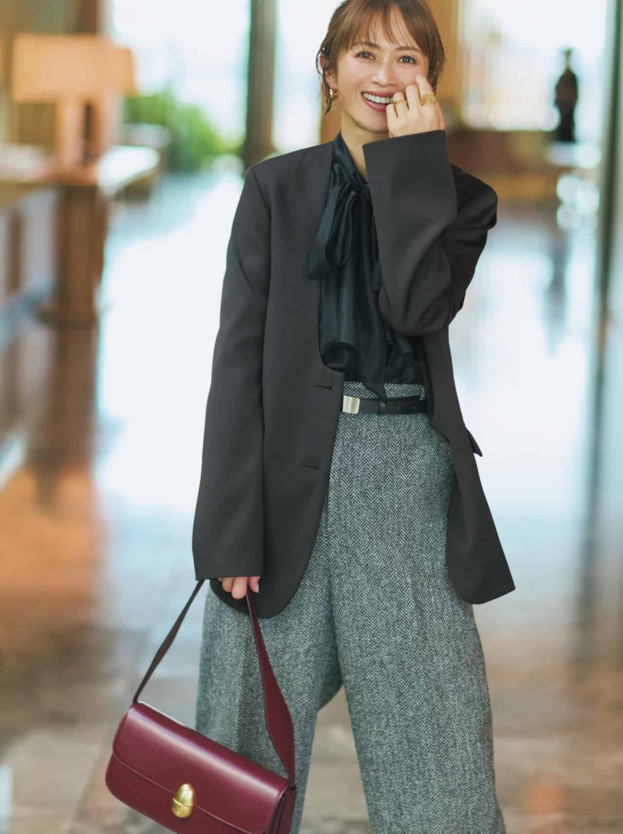 ジャケット¥64,900(エイチ ビューティー&ユース/エイチ ビューティー&ユース)ブラウス¥25,300(アルアバイル)パンツ¥71,500(カオス/カオス丸の内)バッグ¥187,000〈参考価格〉(ネオス/ザ・ウォール ショールーム)ベルト¥24,200(エブール/リトルリーグ インク)ピアス¥76,200太リング¥238,700細リング¥147,400(すべてトムウッド/トムウッド 青山店)