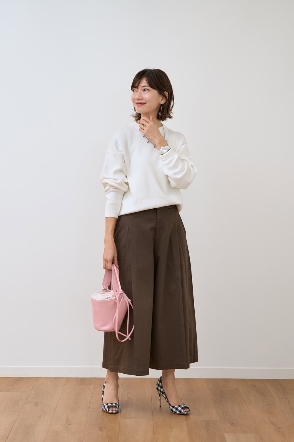 スムースコットンクルーネックセーター¥3,990 コットンキュロット¥3,990(ともにユニクロ:シー/ユニクロ)※トップス、ボトムスはMサイズ着用 バッグ、靴(ともに私物)
