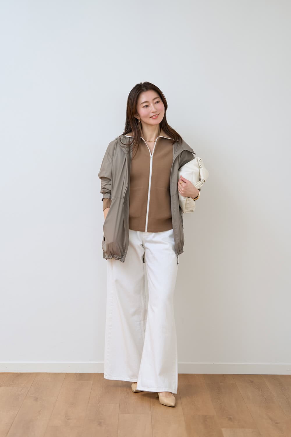 「しっかりとしたミラノリブ編地で、カジュアルアイテムでもきちんとした印象に。また白のジップラインがアクセントになっているのもかっこいいポイント!白ラインに合わせてホワイトデニムをチョイス。上から同色のナイロン素材のシャカシャカパーカを合わせて異素材MIXを楽しむコーデにしてみました。ジャケットを羽織ったり、中にシャツやTシャツを合わせたりしてレイヤードができるので、着回しの幅も広くて活躍間違えなし!」
