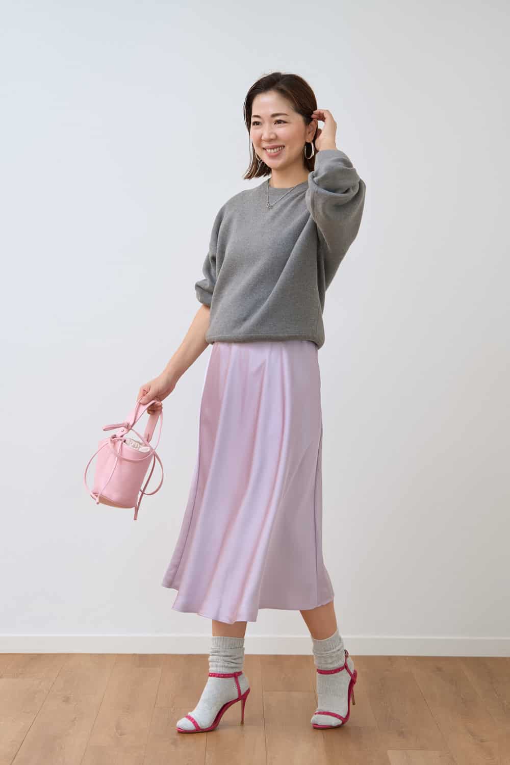 「軽やかなサテン素材のパープルスカートは春の気分を上げてくれます。後ろにはドレープデザインが施され、揺れるシルエットが女性らしさをプラス。柔らかなグレーのトップスとの配色は、スカートの上品さを引き立ててくれます。足元はビビットなピンクのサンダルにグレーのソックスを合わせ、フレッシュ感を。今すぐ取り入れたくなる、春支度にぴったりの今季アイテムとしてお迎えしたいです。」