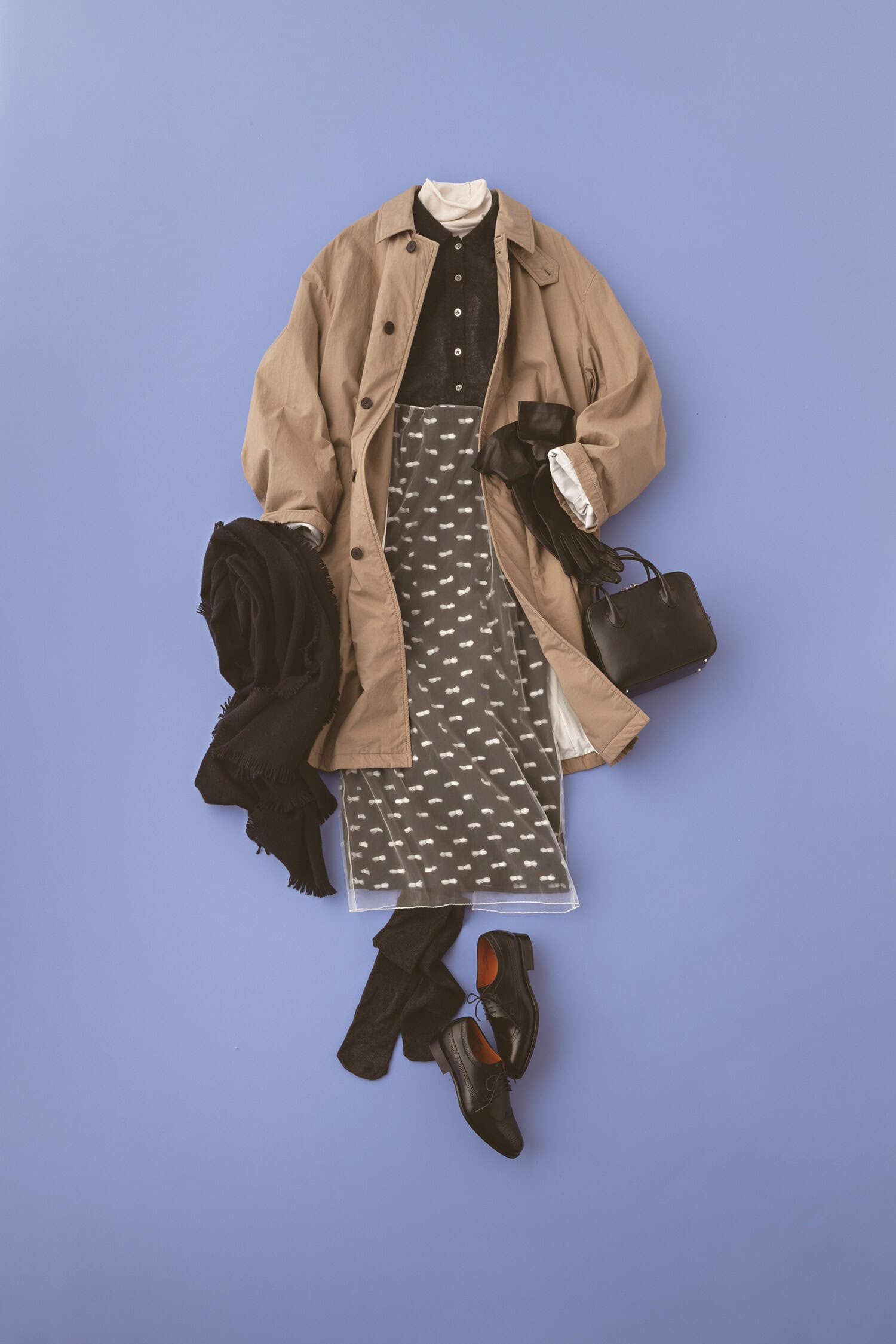 スカート¥30,000(シーニュ)トレンチコート¥143,000(エイトン青山)衿付きニット¥42,900(サクラ/インターリブ)ハイネックニット¥20,000(トゥ)バッグ¥68,200(メゾン カナウ/ヤマニ)シューズ¥39,600(ジャランスリウァヤ 日本橋)ストール¥41,800(アソース メレ/アイネックス)グローブ¥26,400(イタルグアント/アルアバイル)タイツ私物