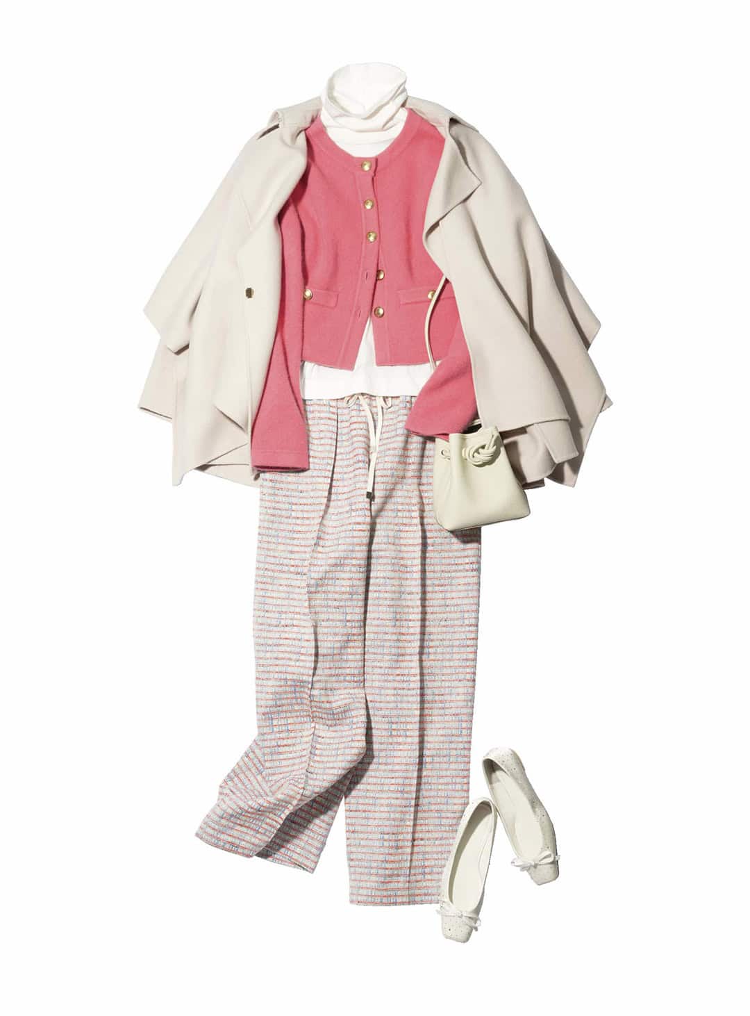 カーディガン¥27,500(マイストラーダ/マイストラーダ プレスルーム)コート¥66,000(カデュネ/カデュネ プレスルーム)タートルネックカットソー¥14,300(スローン/ザ スローン ショップ 新静岡セノバ店)ツイードパンツ¥72,600(ebure/リトルリーグ インク)バッグ¥44,000(ヴァジック/ヴァジックジャパン)パンプス¥29,700(ツル バイ マリコ オイカワ)
