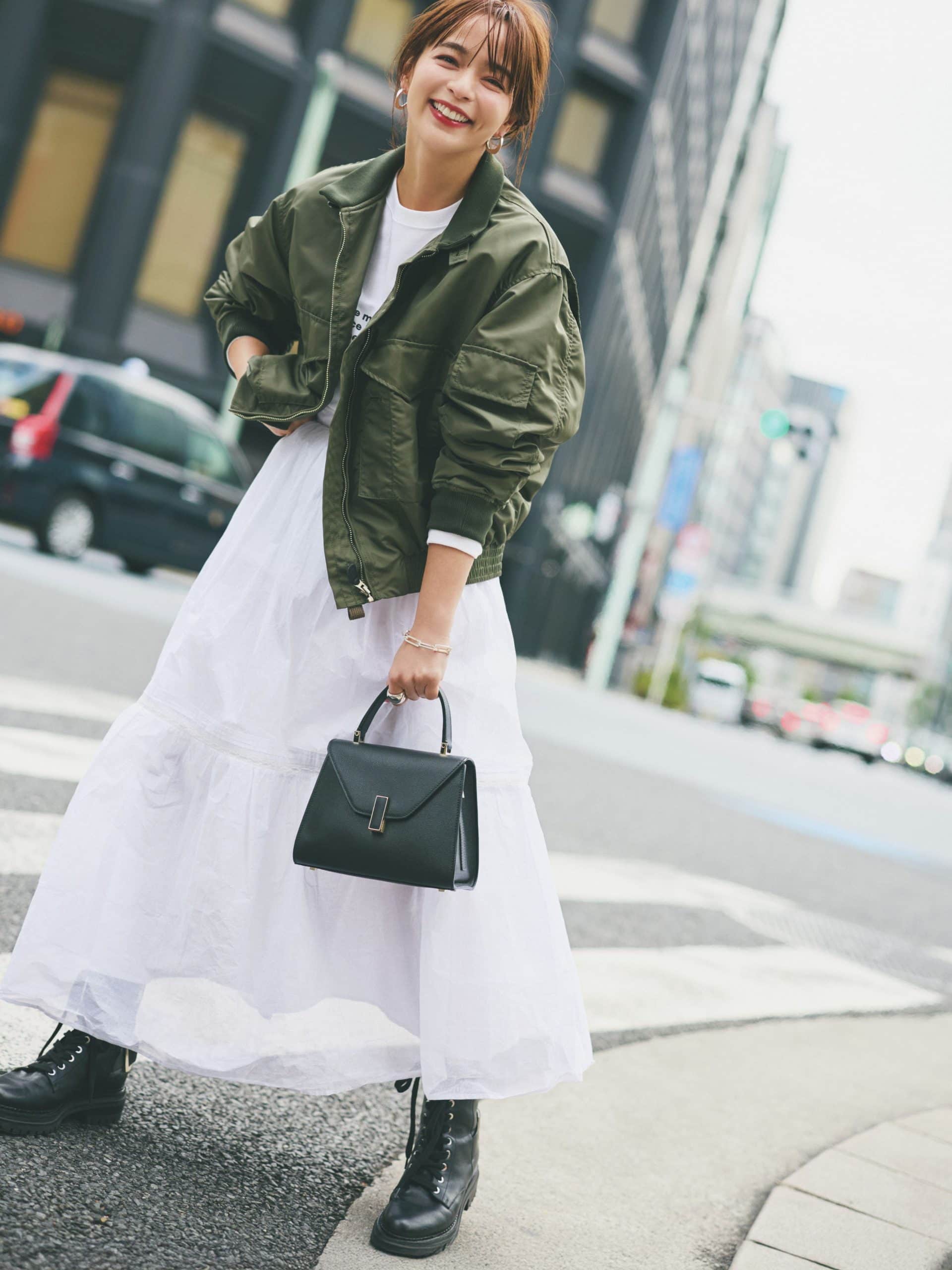 程良い厚みと風を通しにくい素材を備えるミリタリージャケット。白ベースの華やかコーデが気になるなら、ブルゾンはあえてカーキや黒、メンズライクな色味がおすすめ!