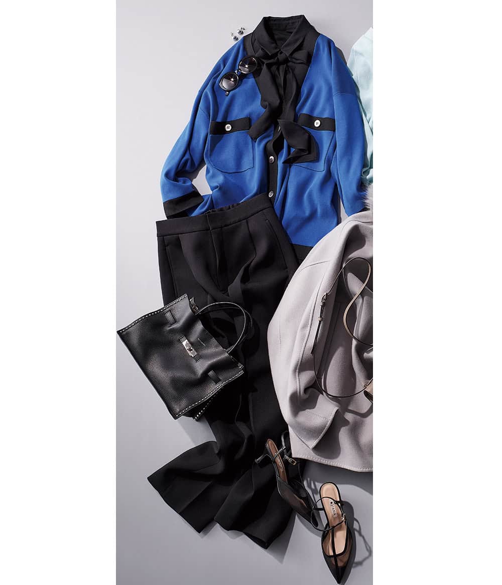 知性や品格を感じさせ、自分を落ち着かせてくれる鮮やかなブルーがここぞの勝負カラー。ネイビー感覚で「ほぼクロ」コーデとも好相性。