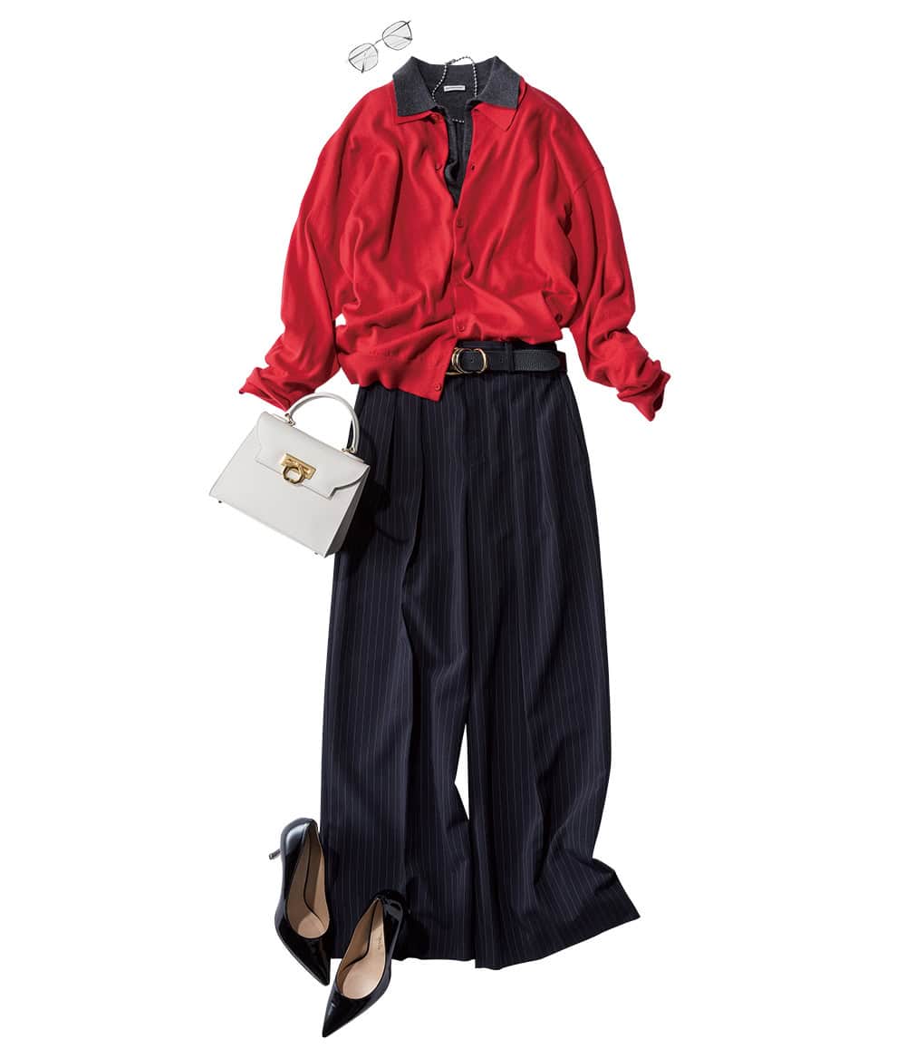 ベーシックカラーのワントーンは、衿をレイヤードする上級コーデで更新して。赤をプラスして知的感アップ。