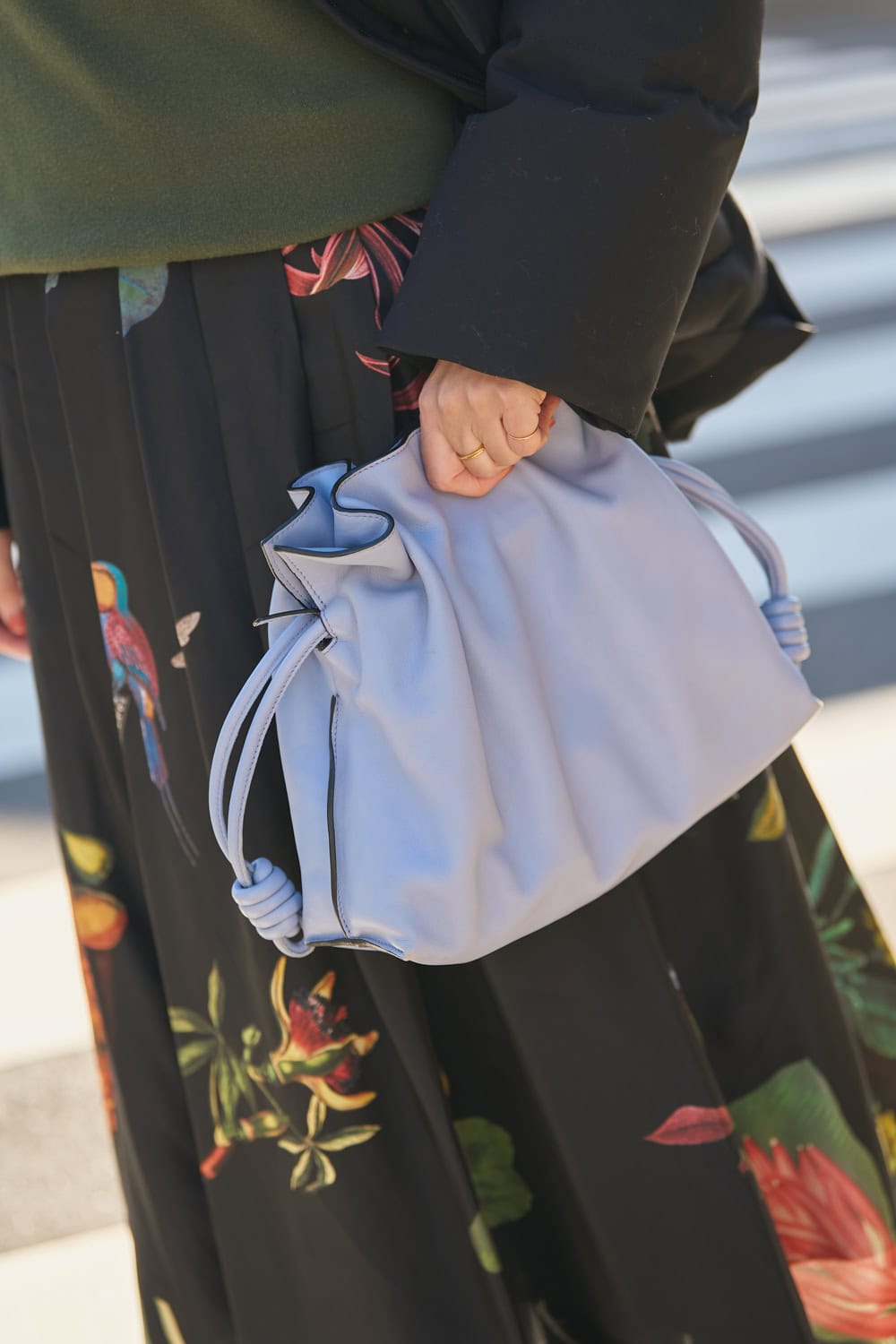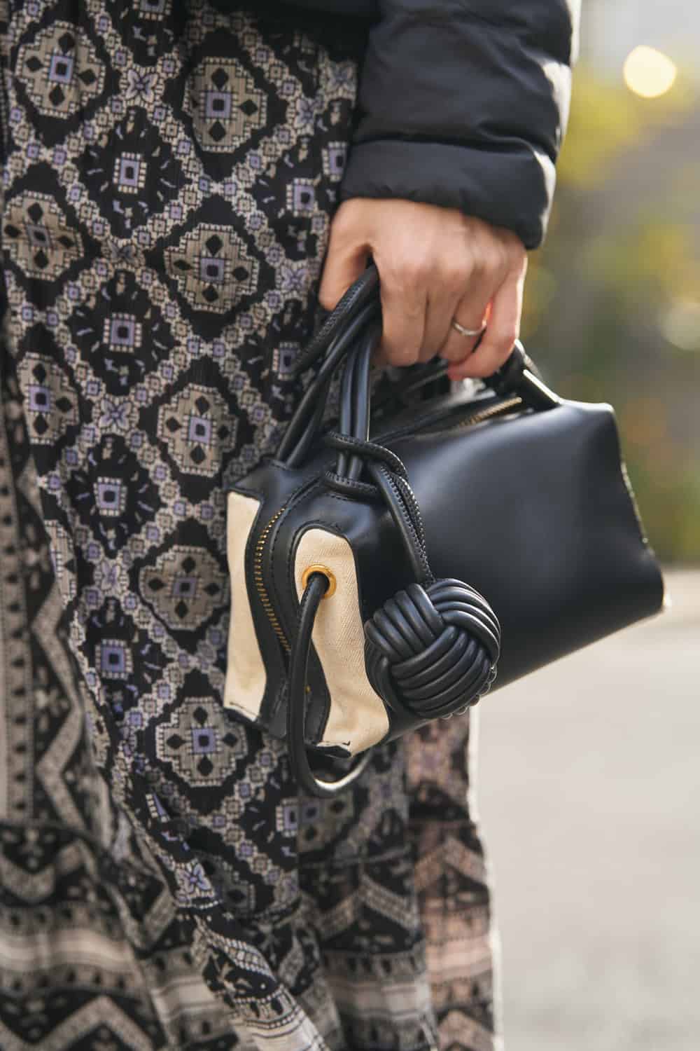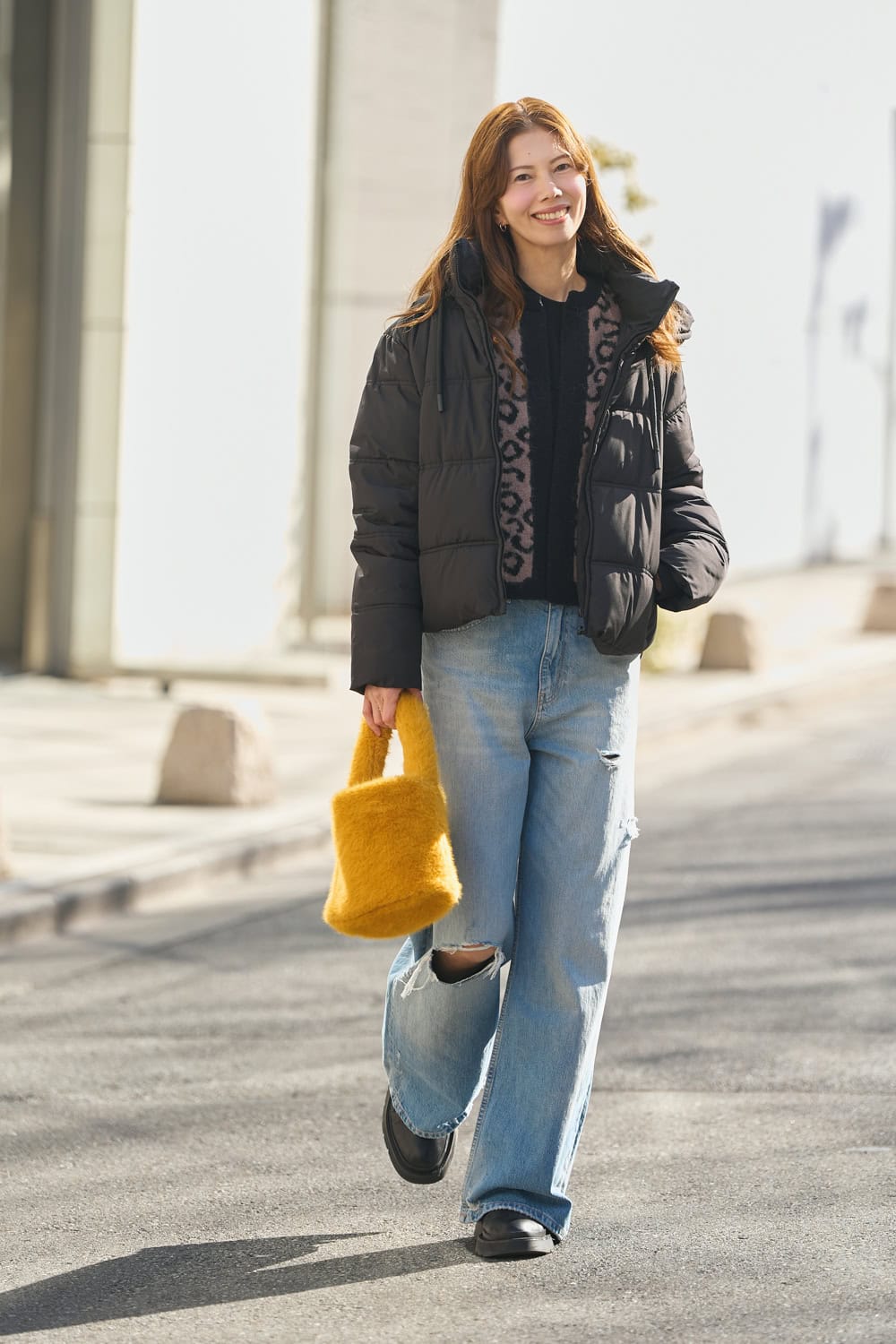 「ZARAのダウンはデザイン性と価格のバランスが魅力的。ブラックダウンは汚れを気にせず羽織れるので子どもとのお出かけなどシーンを選ばず活躍しています。裾のドローストリングを絞れば背中のラインを調節でき、ボトムスに合わせてシルエットを楽しむことができます。シンプルになりがちなデニムスタイルには、レオパード柄のカーディガンとイエローのファーバッグをプラスし、華やかさを演出しました」