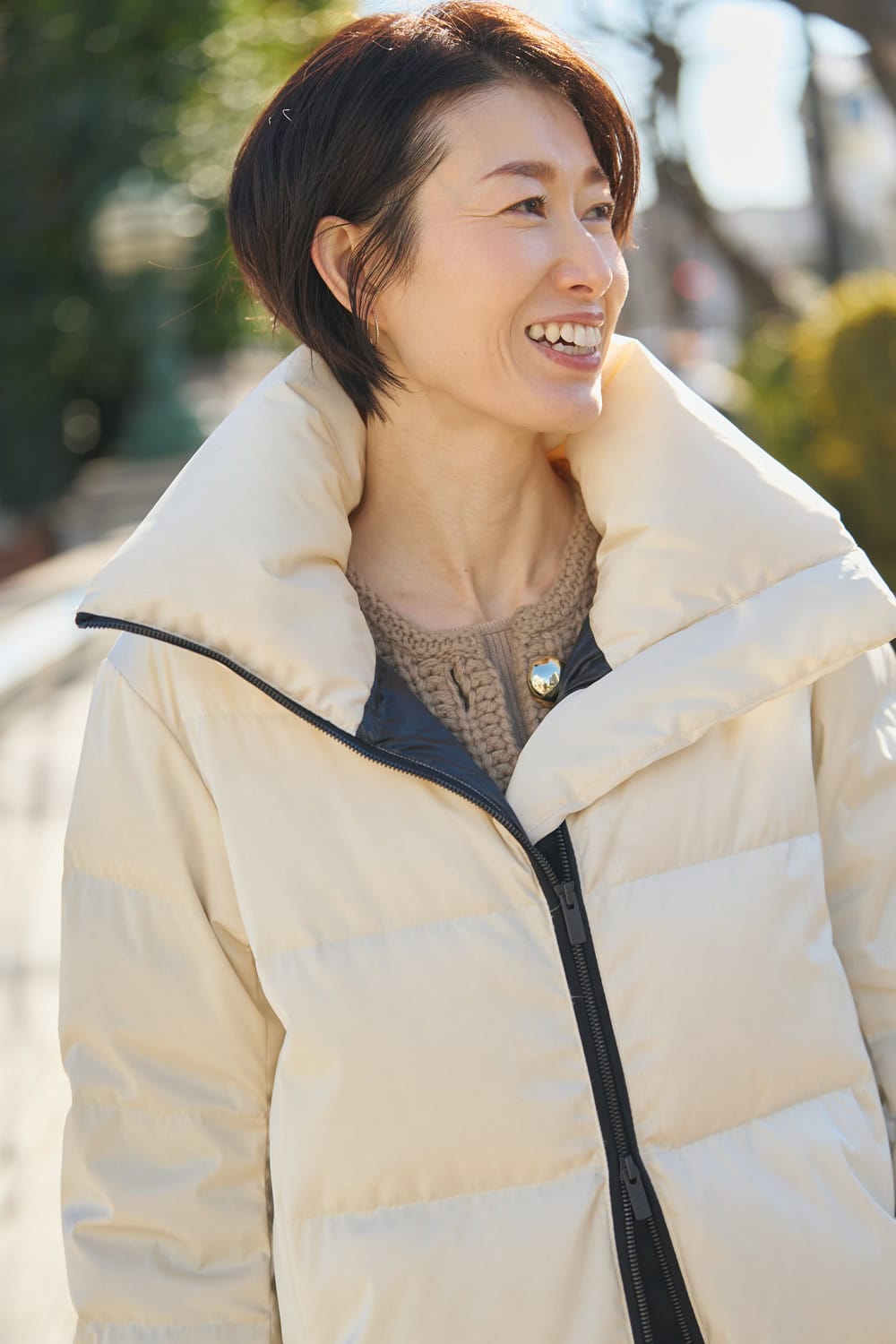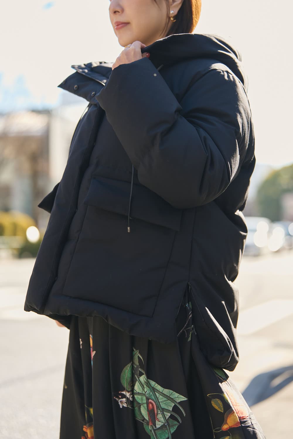 「子どもの幼稚園の送迎で自転車に乗る機会が増え、久しぶりにダウンを新調しました。足さばきのよいショート丈は必須で、サイドジップでスリットにもなるデザインが好みです。シンプルなデザインなのでボトムスを選ばず、数年に一度の大寒波の今冬は厚手のダウンが心強い存在に。重見えしがちな黒ダウンですがマットな質感なので、モードな柄スカートとの相性もよくカジュアルダウンしにくい1枚です」