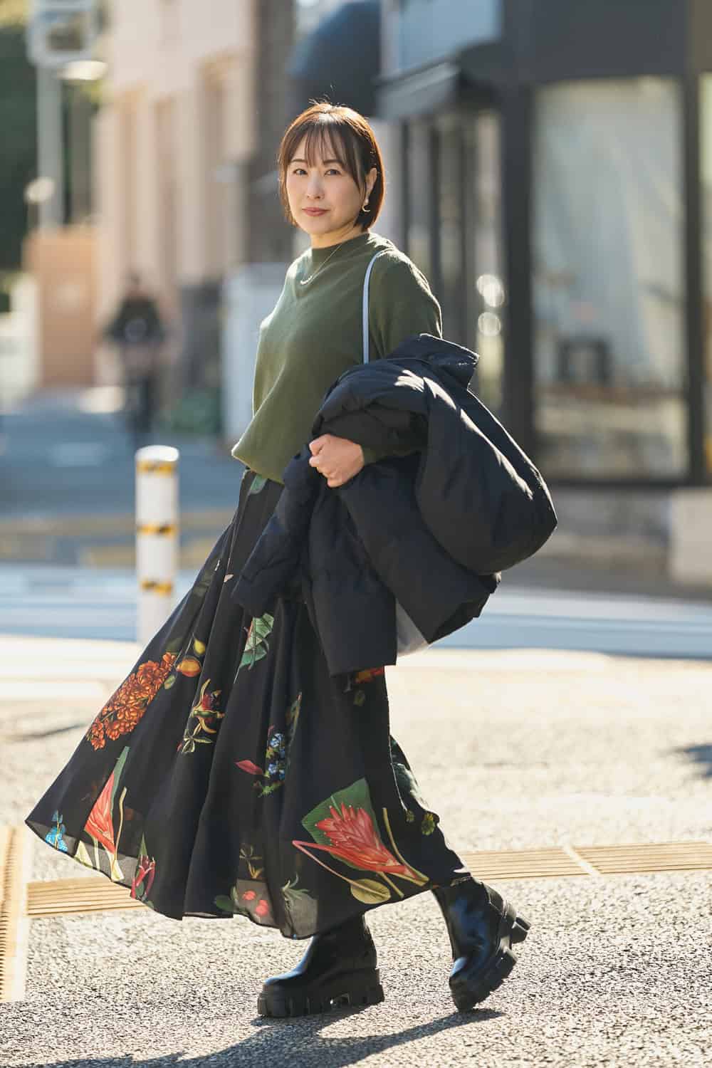 「車移動が多いので、ユニクロのウルトラダウンがちょうどいい存在に。車の乗り降りや着脱の手間が少なく、ストレスフリーで着られるのが魅力の一つです。軽くてコンパクトに畳めるので、持ち運びもスマート。秋に購入したサラマリカの華やかな柄ワンピ―スにラメ入りのプルオーバーを重ねて大人のリラクシーな冬スタイルを楽しんでいます」