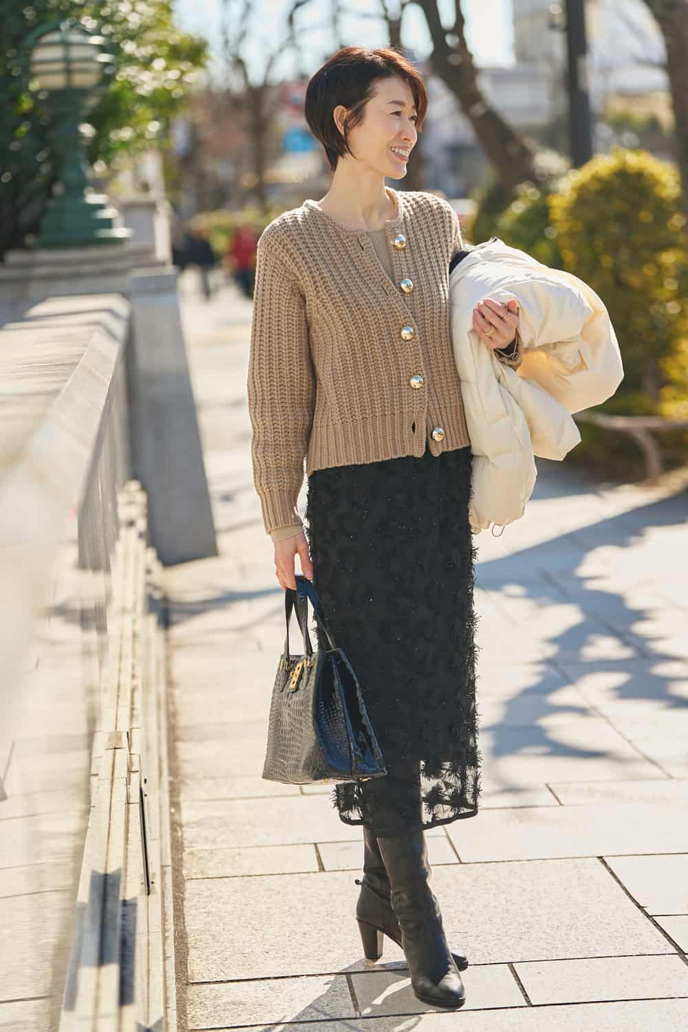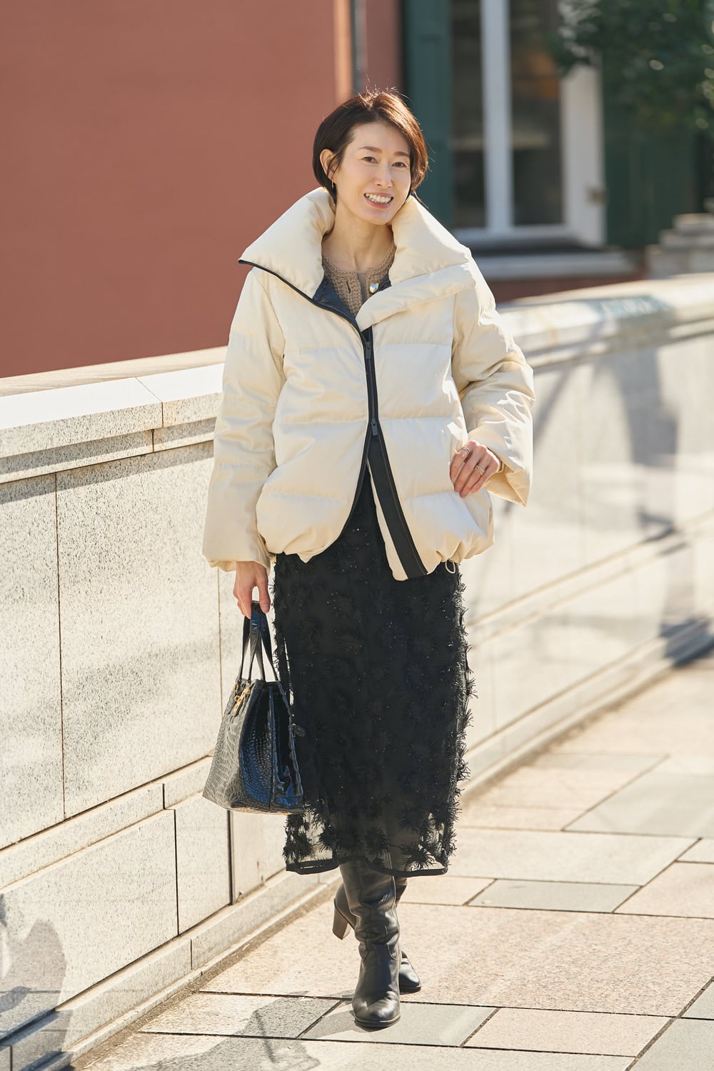 「汚れが目立ちやすい白ダウンは、ショート丈をセレクト。フロントジップは下からも開く仕様で、縦ラインをキレイに見せながらボトムスに合わせてバランスを調節しています。カジュアルなダウンにメリハリを出すため、レースのブラックスカートとヒールブーツを合わせて大人の女性らしさをプラス。トップスは、ざっくり編みのニットカーディガンで柔らかい抜け感を意識しました」