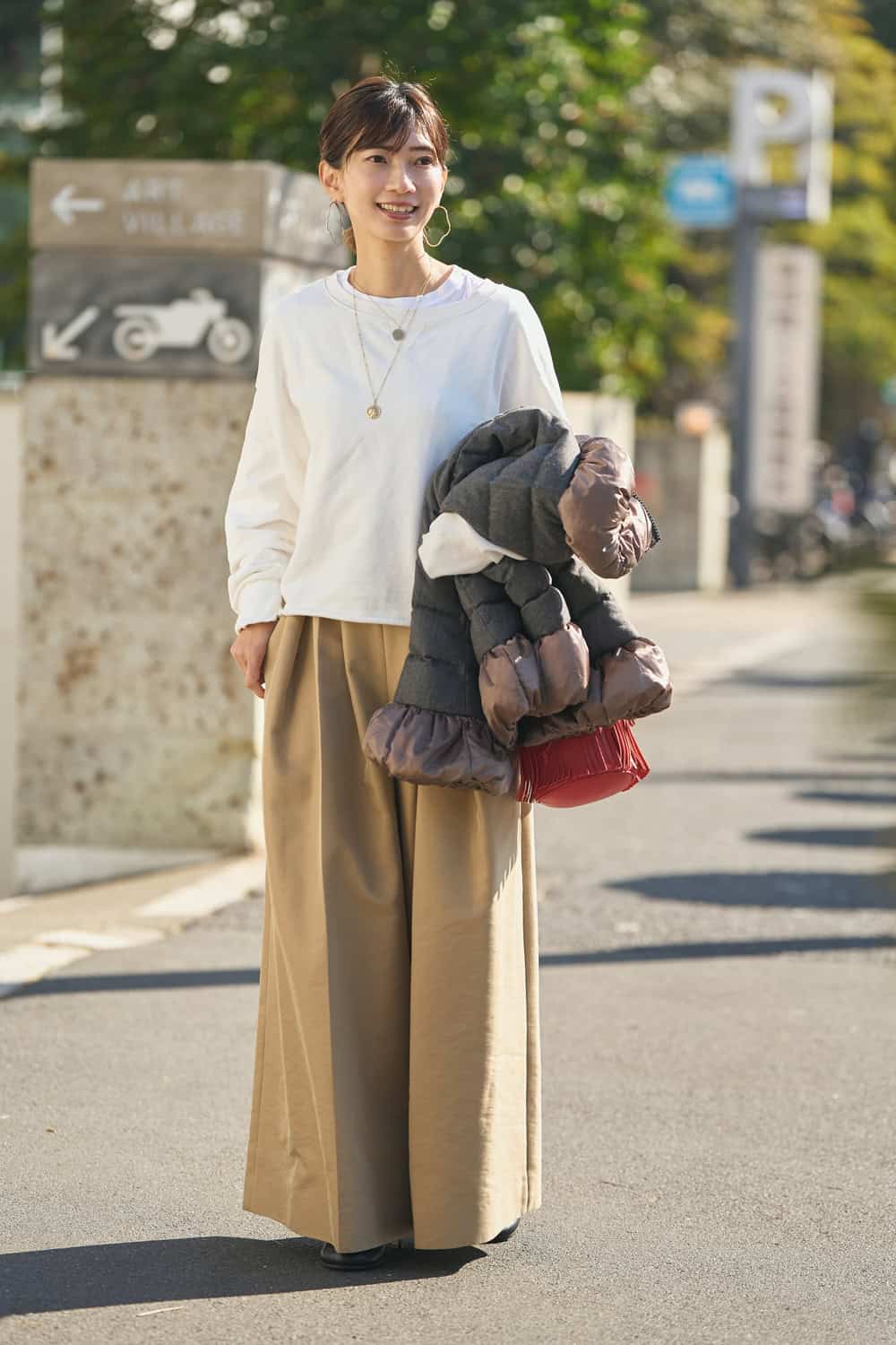 「グレー×ブラウンの配色が斬新で一目惚れしました。全体的にコンパクトながら、裾と襟の構築的なデザインが派手になり過ぎず程よい存在感を演出してくれます。アウターで色を取り入れることで冬のマンネリから脱却。ダブルジップ使用なので開け方次第で表情を変えられてコーデのバランスが決まりやすい。コンパクトなダウンと相性のよいワイドパンツに赤バッグを合わせ、メリハリを付けました」