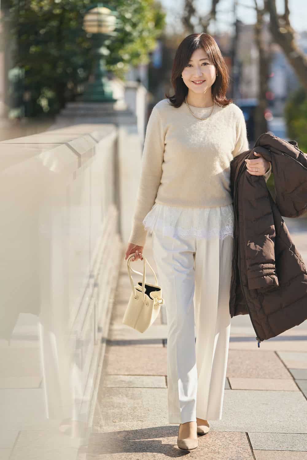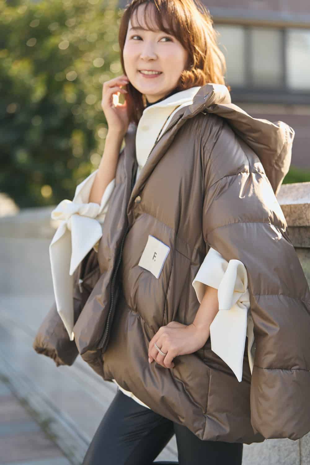 「軽さ、暖かさ、洒落感と、大人が求める条件を満たす一着に即決。ダウンとは思えないほど軽やかな着心地と洗練されたデザインに惹かれました。袖下のファスナーを開けばポンチョ風にも着られ、印象に変化を。今季トレンドのブラウンは柔らかい印象で品よく見せてくれます。大きなリボンの付いた白シャツのボリューム袖を覗かせ、黒のパンツとブーツで引き締め、ヒョウ柄ミニポシェットで遊び心をプラスしました」