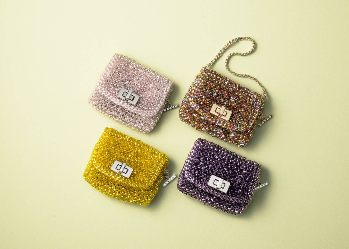 アンテプリマらしいクラシカルなデザインのマイクロバックは、チェーンハンドルや斜めがけにアレンジ可能。キラキラとした煌めきが日常の気分も引き上げ、スタイリングにも高揚感をプラス。