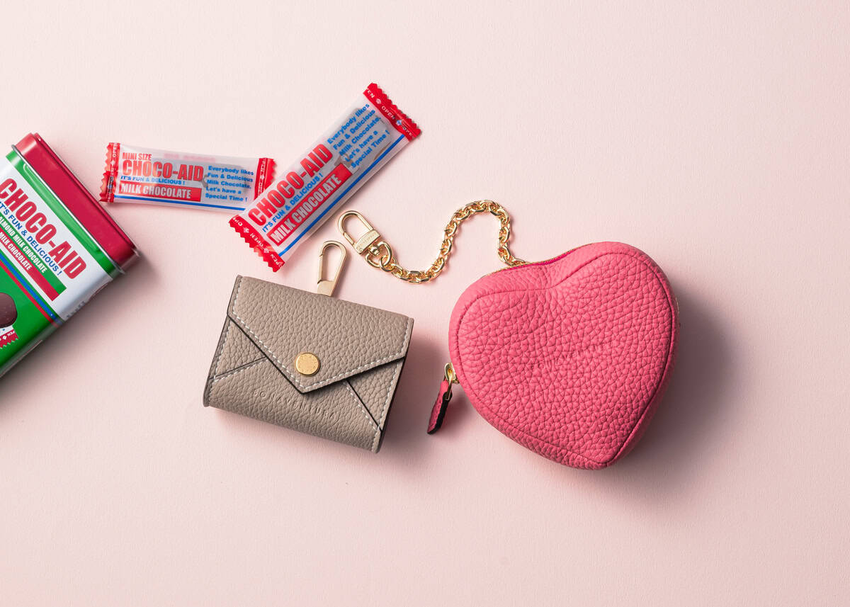 右から順に「ミニポーチ チェーン付き シュリンクレザー(ハート)」[H8×W8.5cm]¥27,500「ミニエンベロープチャーム シュリンクレザー」[H6×W7.5×D3cm]¥19,800(ともにボナベンチュラ)