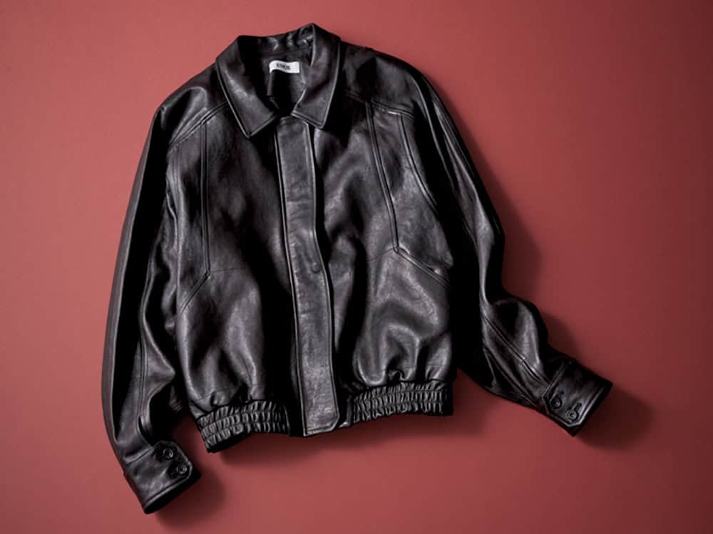 肩パッド入りでもドロップショルダーで体に馴染む。レザージャケット¥95,700(エトス/ハナ コリア)