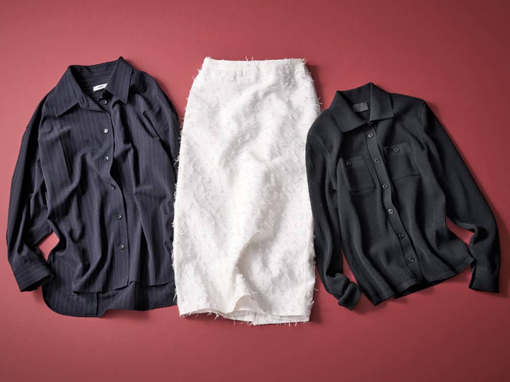 〈左から〉ストライプシャツ、フェザースカート、メッシュニット(トップス、スカートは読者私物)