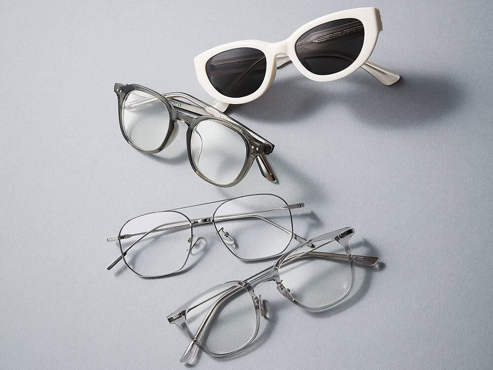 〈上から〉キャットアイのキャッチーな白フレーム。(ライター山本私物)顔馴染みの良いクリアグレー(ライター私物)モード感をプラスするメタルフレーム2点(読者私物)