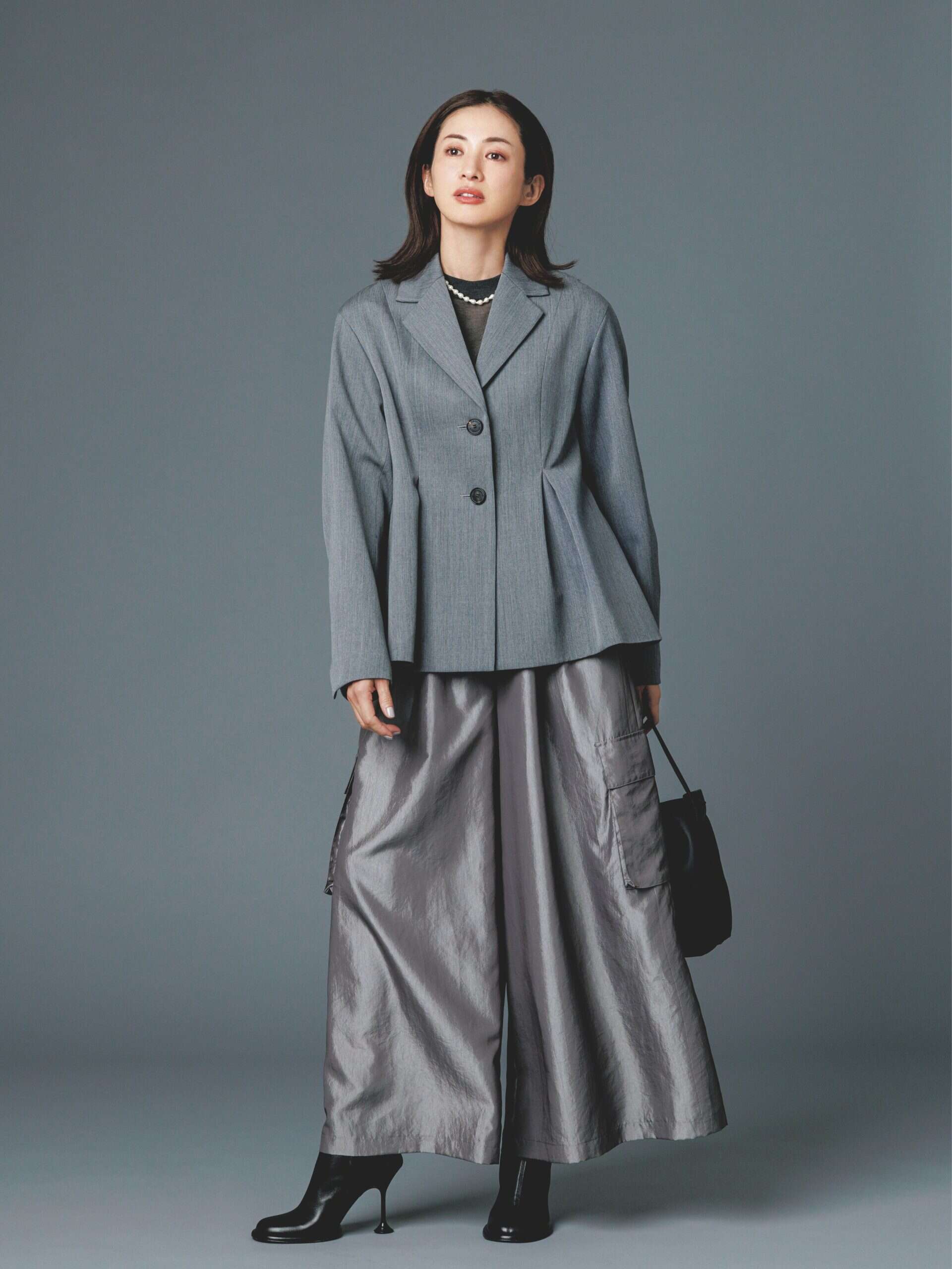 ウエストラインからのペプラムがテーラードジャケットを更新。動きがあることで定番のオフィスウェアが親しみやすい印象に生まれ変わります。トレンドリーなアイテムも知的グレーならこなれすぎず、スマートな着こなしに。
