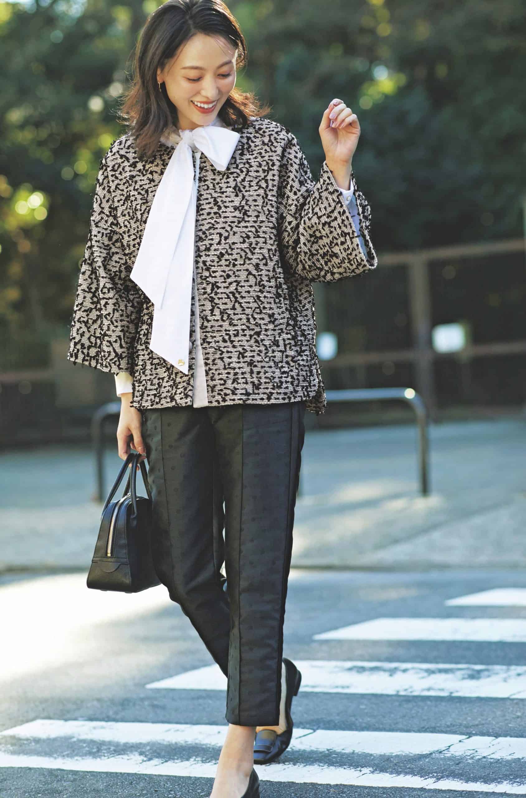ジャケット¥10,980パンツ¥6,980(ともにべベッド)ブラウス¥17,600(ジャスグリッティー/ジャスグリッティー プレスルーム)バッグ¥68,200(メゾン カナウ/ヤマニ)シューズ¥19,250(ダイアナ/ダイアナ 銀座本店)ピアス¥17,600(シトラリー)