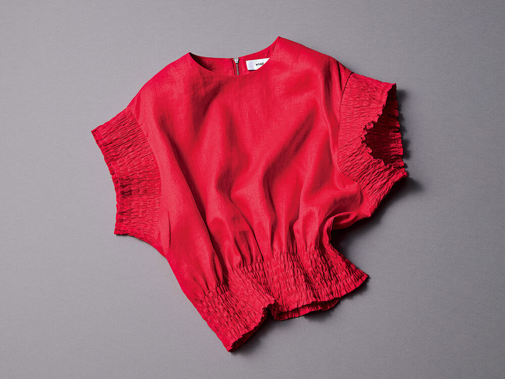 キレイ色のリネン素材。ウエストマークするコンパクトシルエットで、袖のシャーリングがポイントに。ブラウス(ハイク/ボウルズ)
