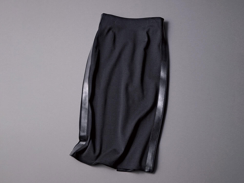 女っぽいタイトスカートにレザー調のサイドラインを効かせた、絶妙な甘辛加減の一着です。春の黒コーデは、こうした華やぎが欲しい。スカート(ランバン コレクション)