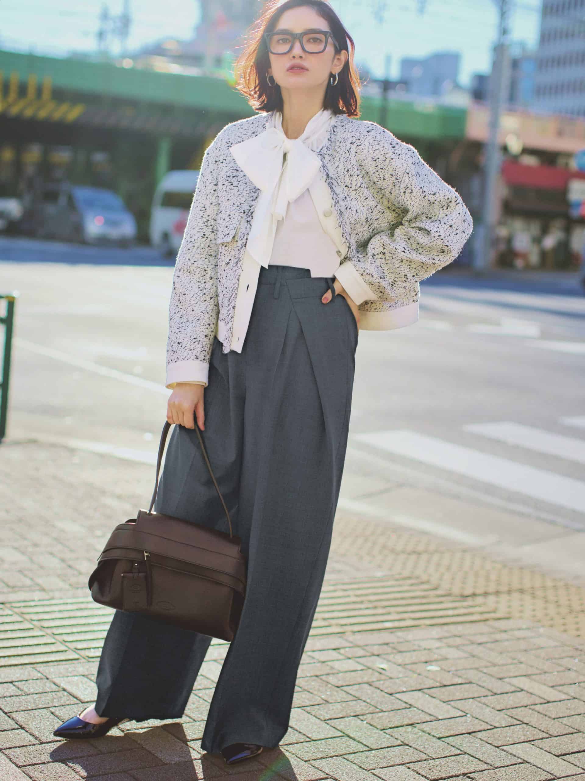 カーデ感覚で着られる、ツイードブルゾンが華やぐジャケパンスタイル。タックからきれい見えするワイドパンツは、ダボっとしたシルエットなのでオフにも活躍が期待できるアイテムです。普段はブラウスのリボンを解いて、ルーズ感を高めると日常らしいリラクシーな着こなしに。