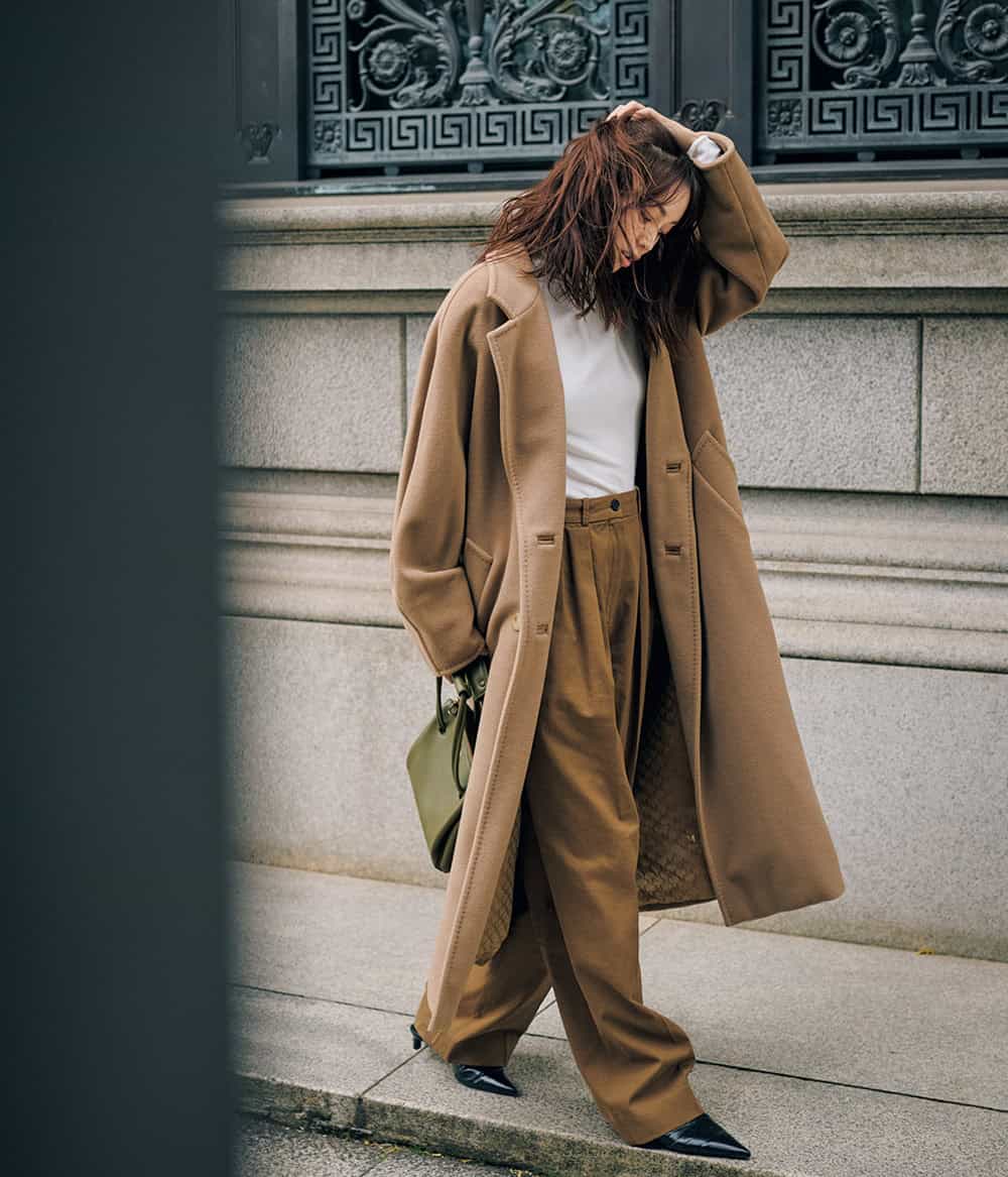 カジュアル好きなら、チノパンは定番。でもどれもしっくりこず、「自分には似合わない」と苦手意識を持っていました。期せずしてドゥロワーで見かけたパンツにグッと胸を摑まれて。素材も色も理想どおり。試着したら、「素敵~」と思わず声が漏れるほどうっとり。この高揚感はレアだと思ったことと、パパッと配色バランスが浮かんだのも決め手に。ベージュでワントーンにしても締まるし、ブラックやネイビーはもちろんのこと、グレーやブラウンにも合う。間違いなくオシャレ見えすると確信し、お迎えしました。