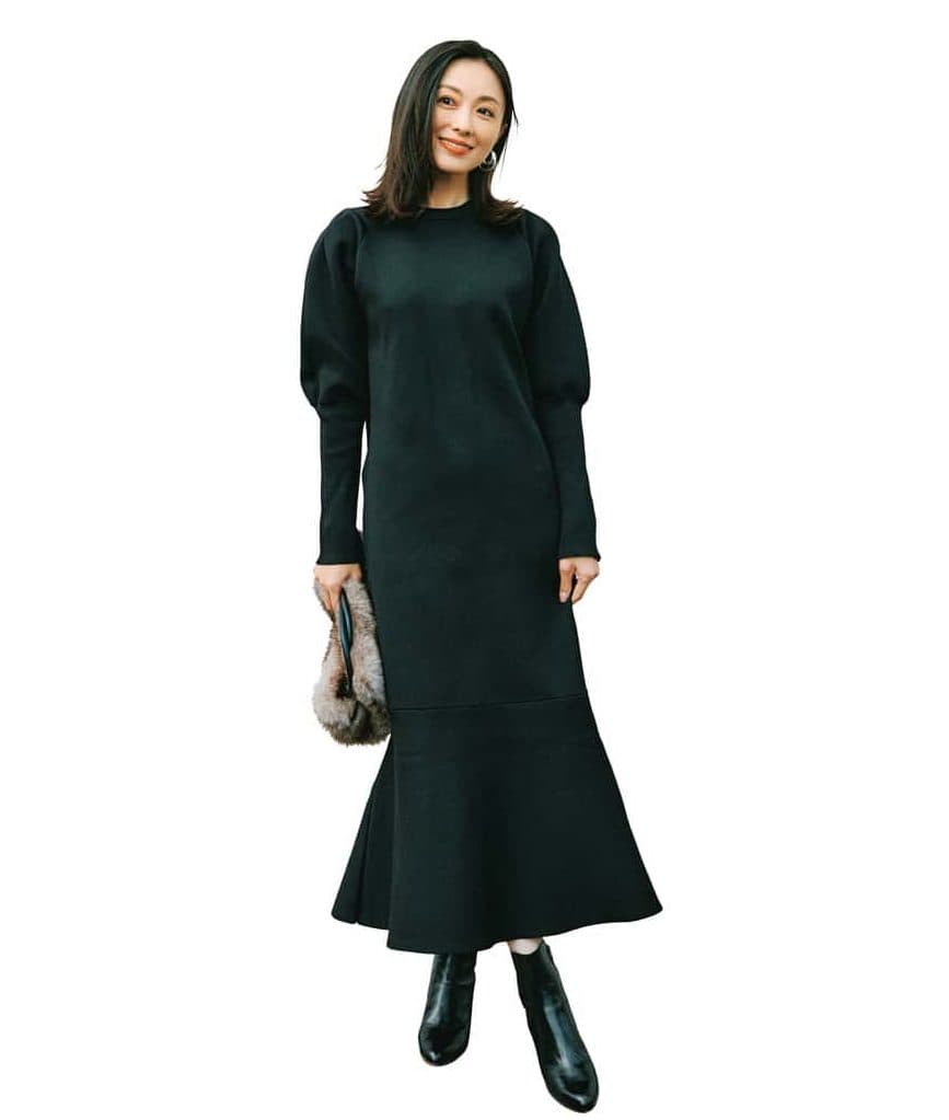 パフスリーブと裾のマーメイドラインが際立つ上品なシルエットは仕事でもイベント服としても活躍!オールブラックでまとめて足元はショートブーツで引き締めると、大人っぽくモードな佇まいに。