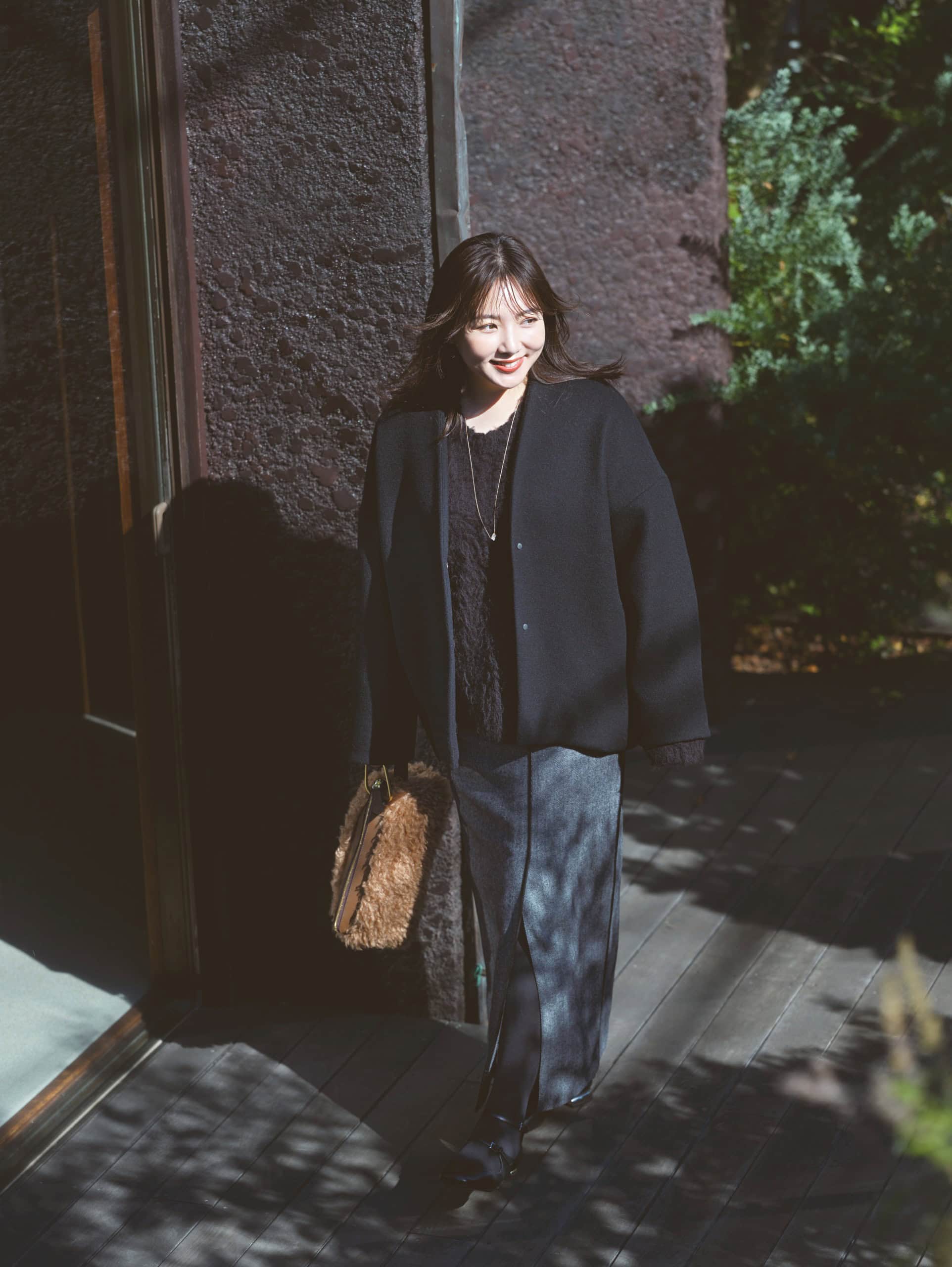 丸みのあるフォルムが体のラインを自然にカバー。ノーカラーのすっきり感が重たく見せず、きれいめにもカジュアルにも自在に対応。Iラインスカート合わせで、黒の存在感もぐっとマイルドに。