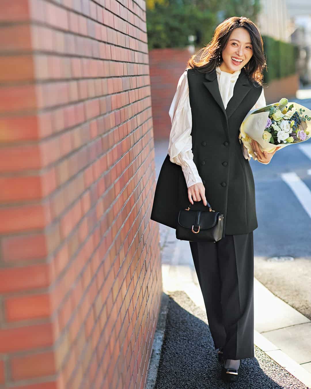 ジレ¥13,800ブラウス¥6,420(ともにミュー)パンツ¥15,950(DAY by DAY It,s international)バッグ¥22,900(チャールズ&キース/チャールズ&キース ジャパン)パンプス¥33,000(銀座かねまつ/銀座かねまつ6丁目本店)ピアス¥27,500〈ebiki〉リング¥18,700〈yuma〉(ともにロードス)ストッキング¥1,100(靴下屋/タビオ)