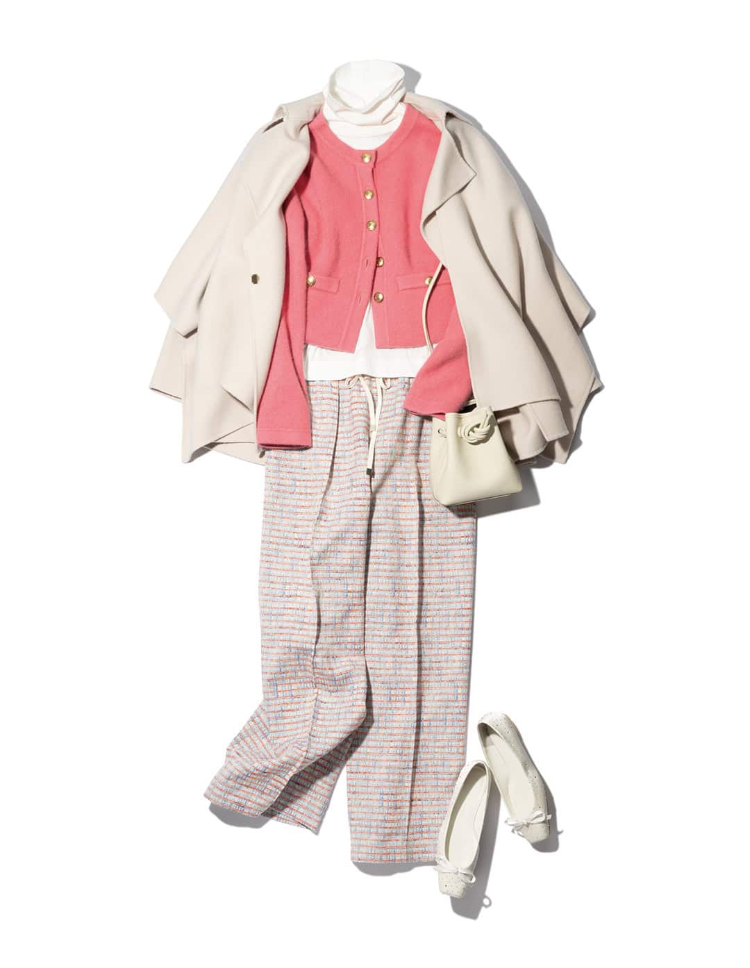 気分を上げたいお出かけの日は、ピンクを抜擢。くすんだ色味なら上品な大人コーデにシフトできます。バッグは白ショルダー、足元はバレエシューズで、華やぎと歩きやすさも両立。