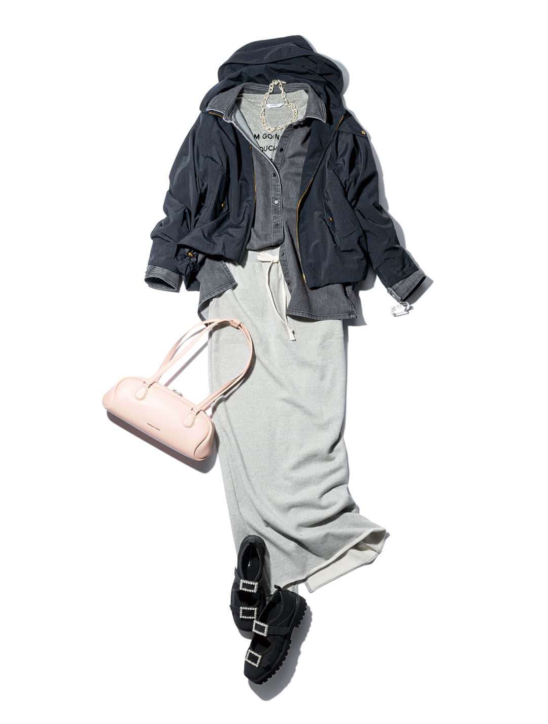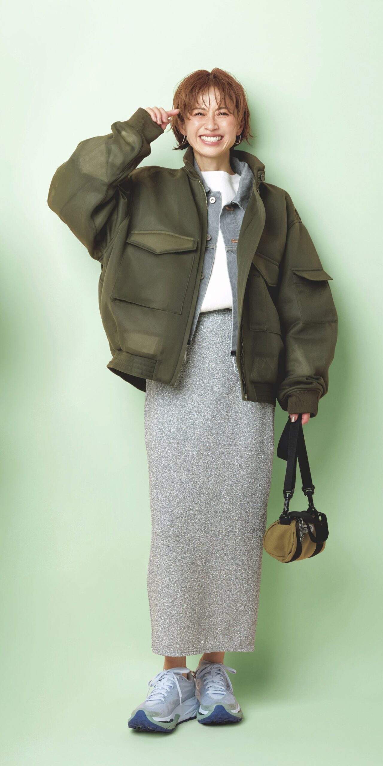 撥水ブルゾン¥36,300(ルーニィ)デニムシャツ¥14,000(PLST) Tシャツ¥17,600(フィーニー)スカート¥27,500(サクラ/インターリブ)バッグ¥12,900(チャールズ&キース/チャールズ&キース ジャパン)シューズ¥38,500(ツル バイ マリコ オイカワ)ネックレス¥31,860バングル¥4,620(ともにアビステ)