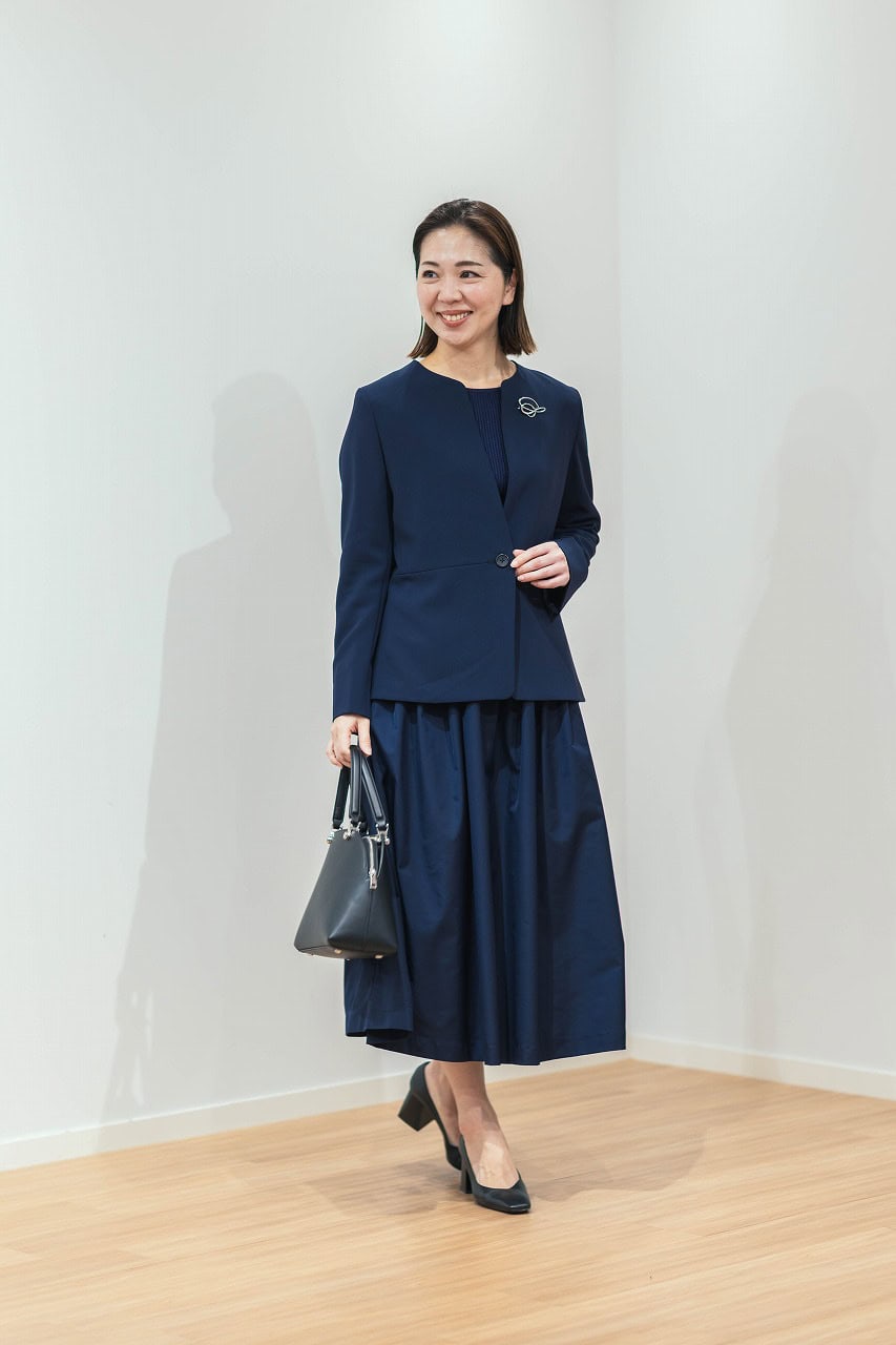 「ネックラインがすっきりとしたデザインのジャケットに、ふんわり広がるフレアスカートを合わせ、甘くエレガントに装いました。程よくくびれたウエストから自然に広がるフレアラインが女性らしさと気品を引き立ててくれます。柔らかい光沢をまとったスカートが華やぎをプラスし、優しい印象に演出してくれます。華美過ぎないスタイルで写真映えしてくれそう」