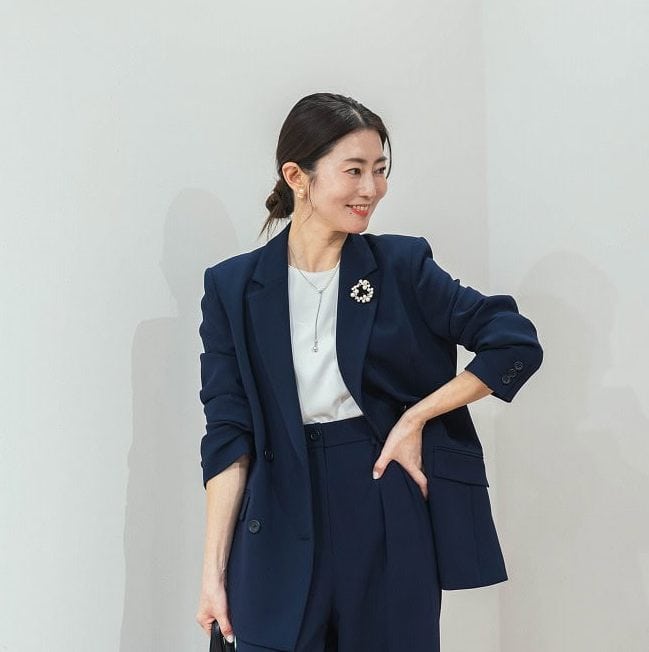 「式典服の王道カラーといえばネイビー!今回ハンサム系ママにオススメしたいのが、ダブルジャケット+ワイドパンツの組み合わせ。ジャケットは大きめを選び、きちんと見せつつもオーバーサイズ気味に着たのがポイント。パンツは美脚に見せてくれる太めのワイドを合わせて今っぽい雰囲気に。セレモニーだけでなく、お仕事でも活躍間違えなしの組み合わせで、オールシーズン着用できるのも◎」