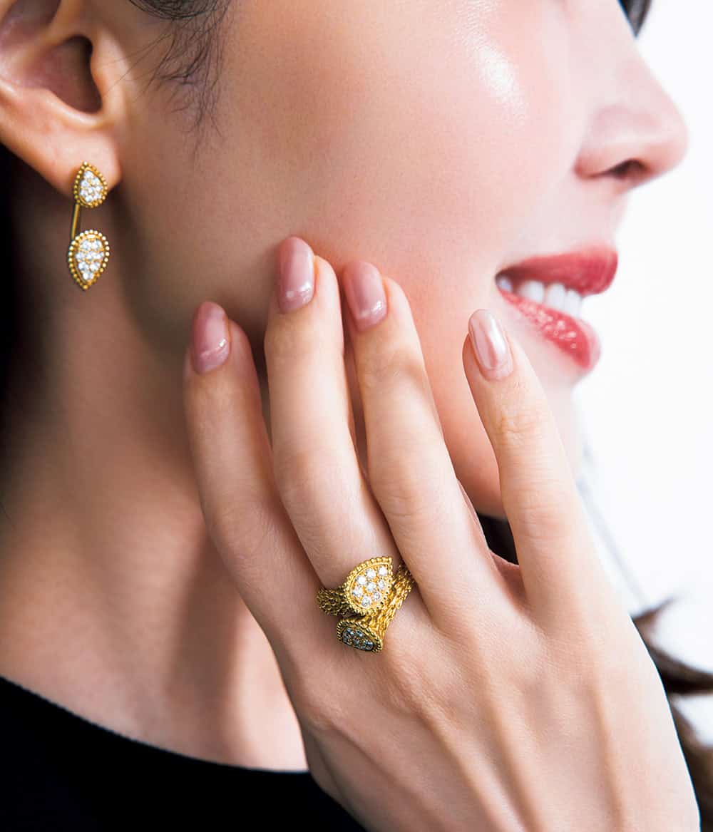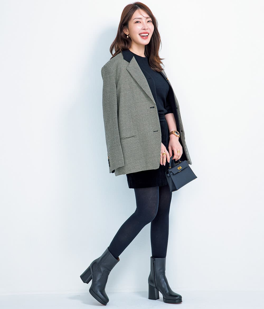 ジャケット/EENK ニット/Drawer スカート/MY WEAKNESS バッグ、リング/HERMÈS ブーツ/ヴァレンティノ ピアス、リング/ブシュロン 時計/オーデマ ピゲ