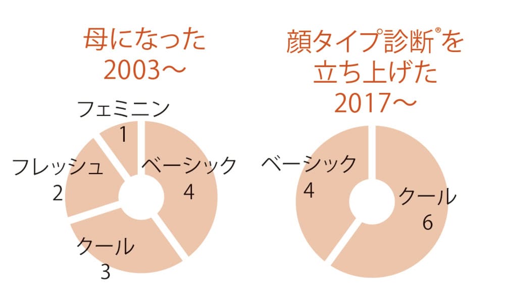 私自身も、顔タイプに出合う10年前までは、たくさん物を買っていろいろなキャラになりきることがオシャレだと思っていました。顔タイプで自分が〝クール〟と知ったことで「似合う」が主軸になり、自分自身を主人公に設定。そこにトレンド、気分、相手、仕事や「どう見せたいか」を掛け合わせられるように。例えば自分が食材でいうと「ジャガイモ」と自覚したら、さぁそれをどう料理しよう? となるわけで、決して「ケーキ」になろうとはしない。そもそもフィールドが違うから、着られない服を着ている人に対して劣等感を持ったり、無理に引き寄せようとしなくなりました。