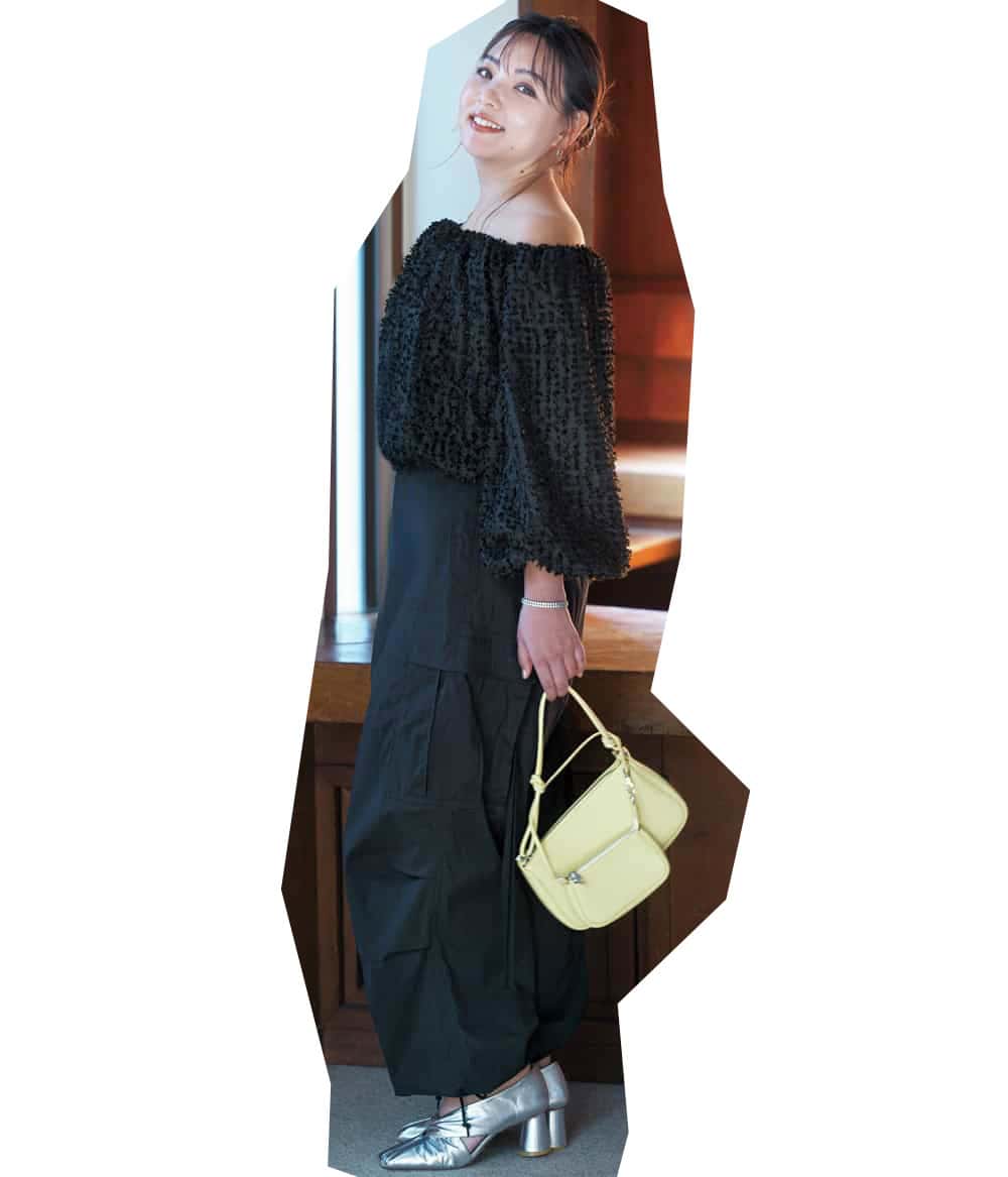 素材の表情豊かな短か丈トップスにハイウエストパンツを合わせて肌見せもヘルシーに。ほぼ黒でまとめれば、甘さも中和されて嫌味のない女っぽさが漂います。カラー小物で軽やかさをプラスして春を先取り。