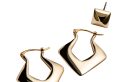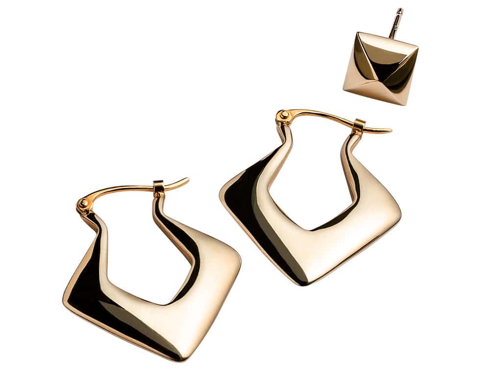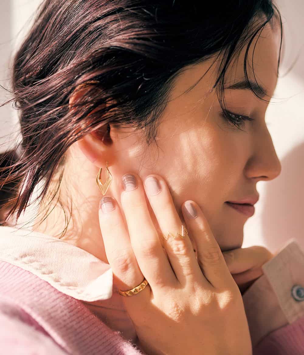 スクエアスタッズ〈K18YG〉(両耳価格)¥154,000 (カドー/CADEAUX六本木ヒルズ店)ダイヤシェイプフープ〈K18YG〉¥51,700(プリーク/エイチ ビューティー&ユース)リング(人差し指)¥363,000(薬指)¥209,000(ともにカドー/CADEAUX六本木ヒルズ店)ポロニット¥17,600(マイストラーダ)デニムシャツ¥19,800(アルページュ ストーリー)