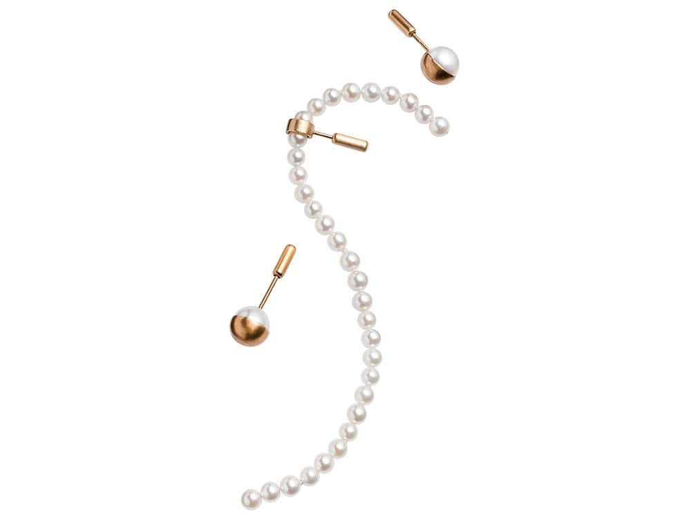 一粒パール〈あこやパール×K18YG〉¥77,000 ロングパール〈あこやパール×K18YG〉70㎜¥110,000留め具〈18KYG〉¥66,000 一粒パール〈あこやパール×K18YG〉¥77,000(すべてシハラ/シハラ トウキョウ)ニット¥37,400(アルページュ ストーリー)肩にかけたニット¥39,600(デパリエ/デパリエ 伊勢丹新宿店)