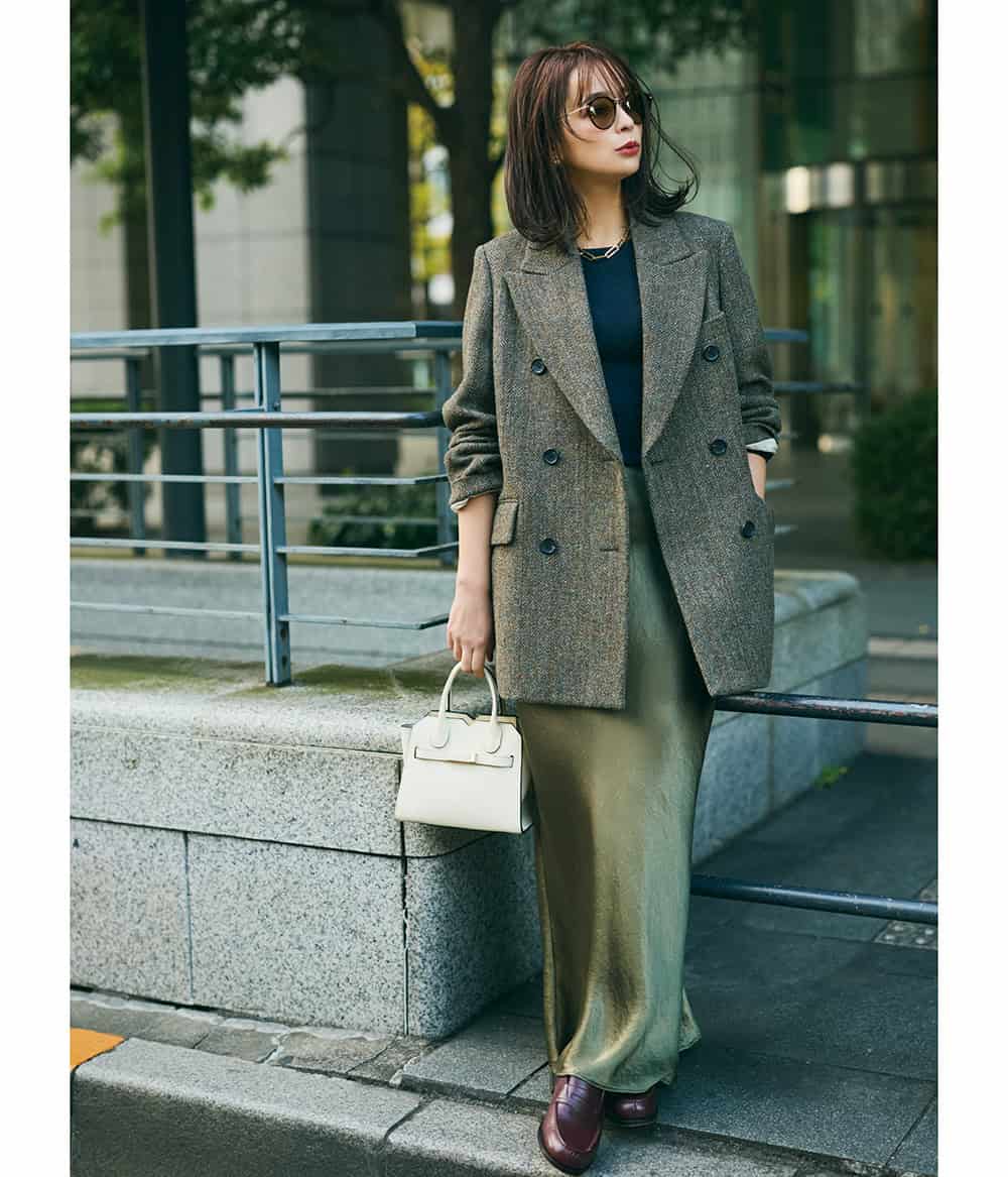 シャープなIラインと自然にドレープが生まれるツヤ素材、床すれすれのマキシ丈でリッチ感を。地厚でドライなジャコット風を羽織ってスタイリッシュにまとめて。