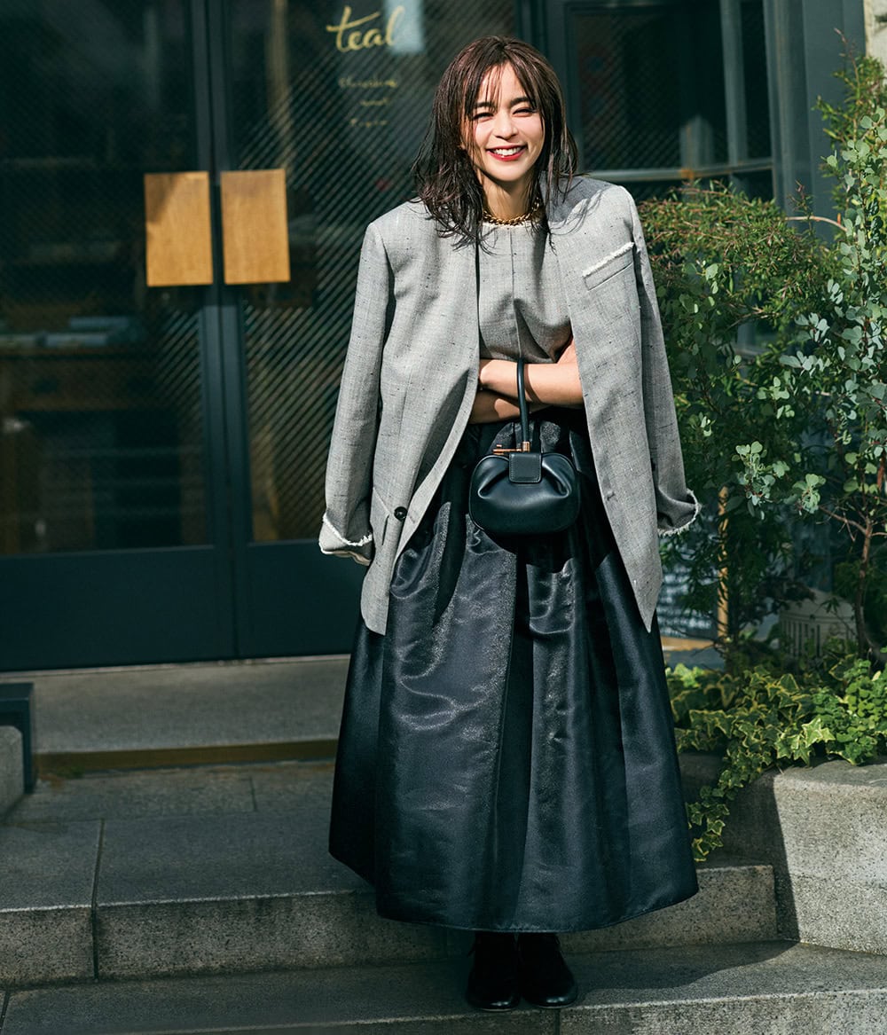 ドレスライクな素材感と構築的なシルエット。クチュール感たっぷりのボリュームスカートをマニッシュなビッグジャケットで調和させた〝甘ニッシュ〟の王道スタイル。