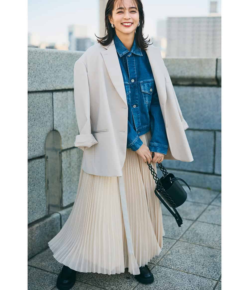 ボリュームたっぷりでドラマチック度が高い分、ともするとコンサバに転びがちな細プリーツ。ビッグジャケット&Gジャンでクール要素とこなれ感を意識して。