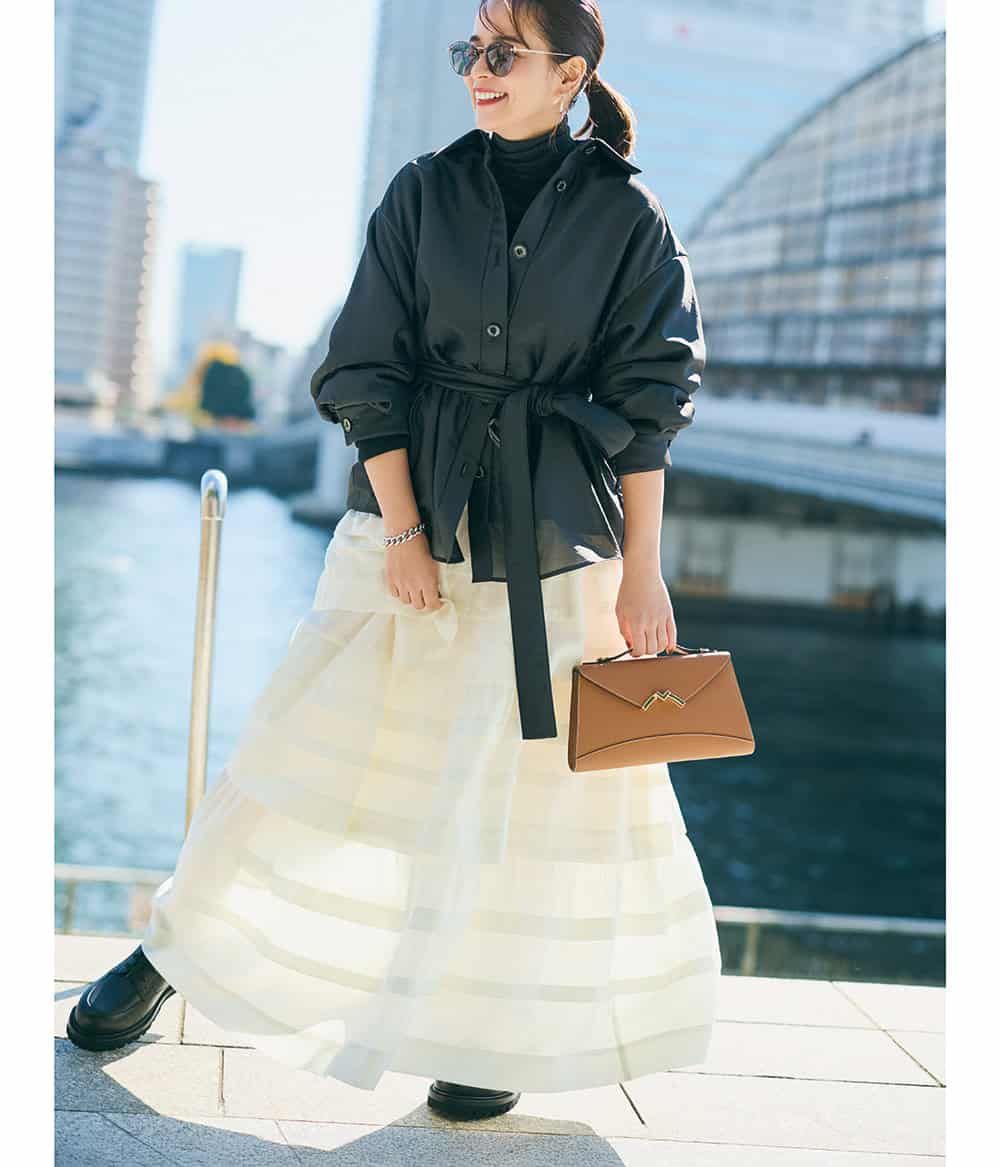 立体感のある華やぎで、柄スカート感覚で着られるティアード。ボリュームがある分、ウエストマークのシャツジャケットでキリッと感をON。ブランドは着映えスカートとして定評のある〝Sov.〟。いくつも切り替えられた段差で生まれる優雅な揺れ感は唯一無二。