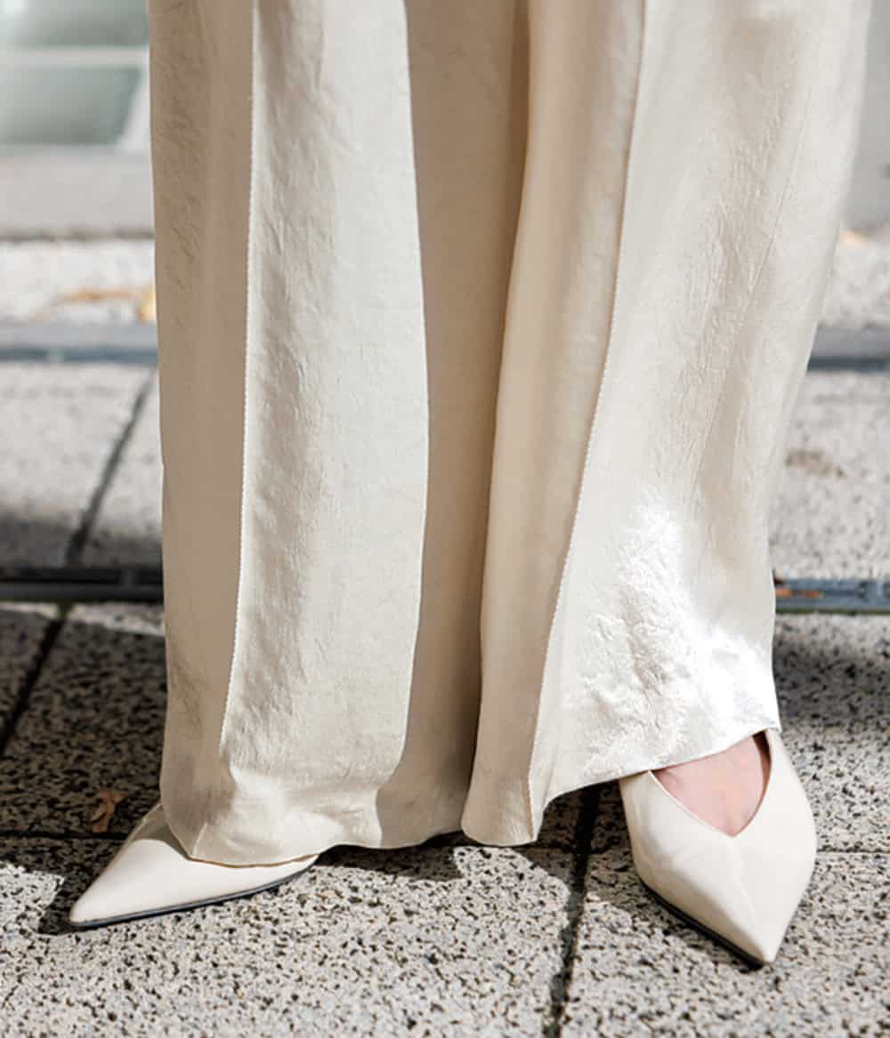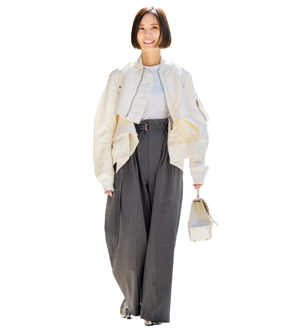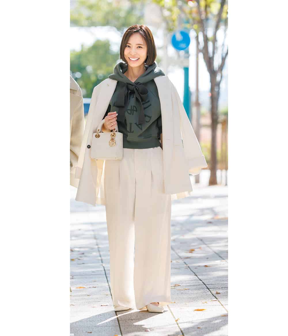 一歩間違えるとかっちり見えて難易度高めなホワイトコーデは、あえて別々のものをセットアップ風に合わせることで抜け感を演出。スタニングルアーのパンツはサテン地とワイドシルエットが絶妙。カーキのフーディをレイヤードしてカジュアル要素もプラスします。